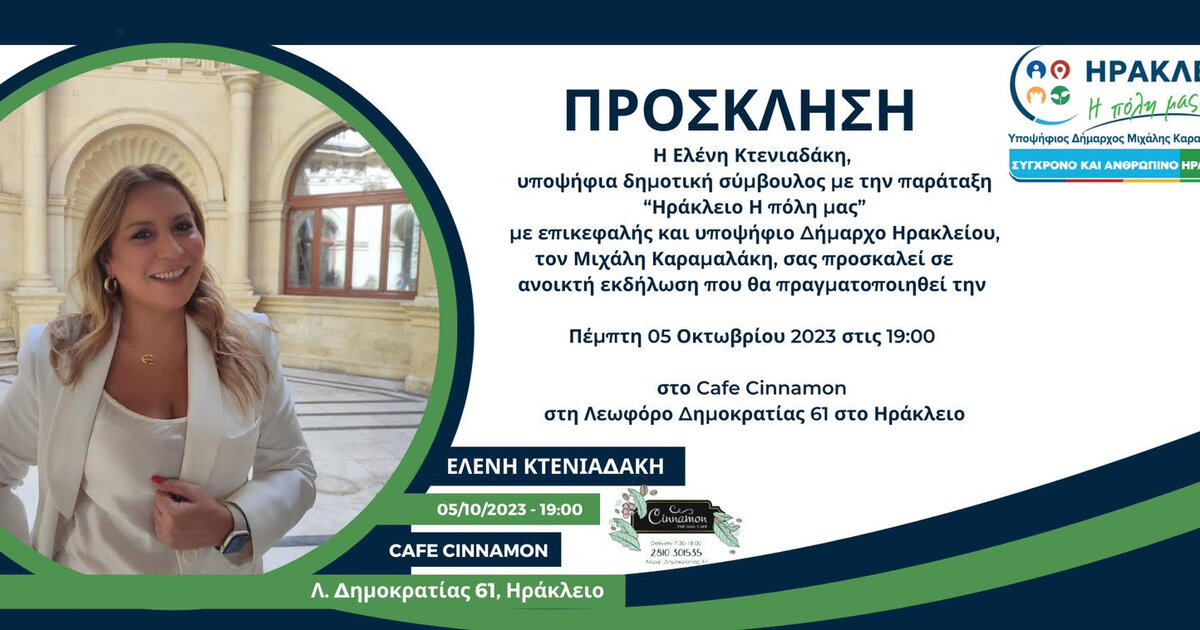 "Σας καλώ να συζητήσουμε για το πως το Ηράκλειο θα κερδίσει το χαμένο έδαφος και θα γίνει μια σύγχρονη, λειτουργική και βιώσιμη πόλη για τους Ηρακλειώτες αλλά και τους επισκέπτες της" - αναφέρει στο κάλεσμά της η Ελένη Κτενιαδάκη.
