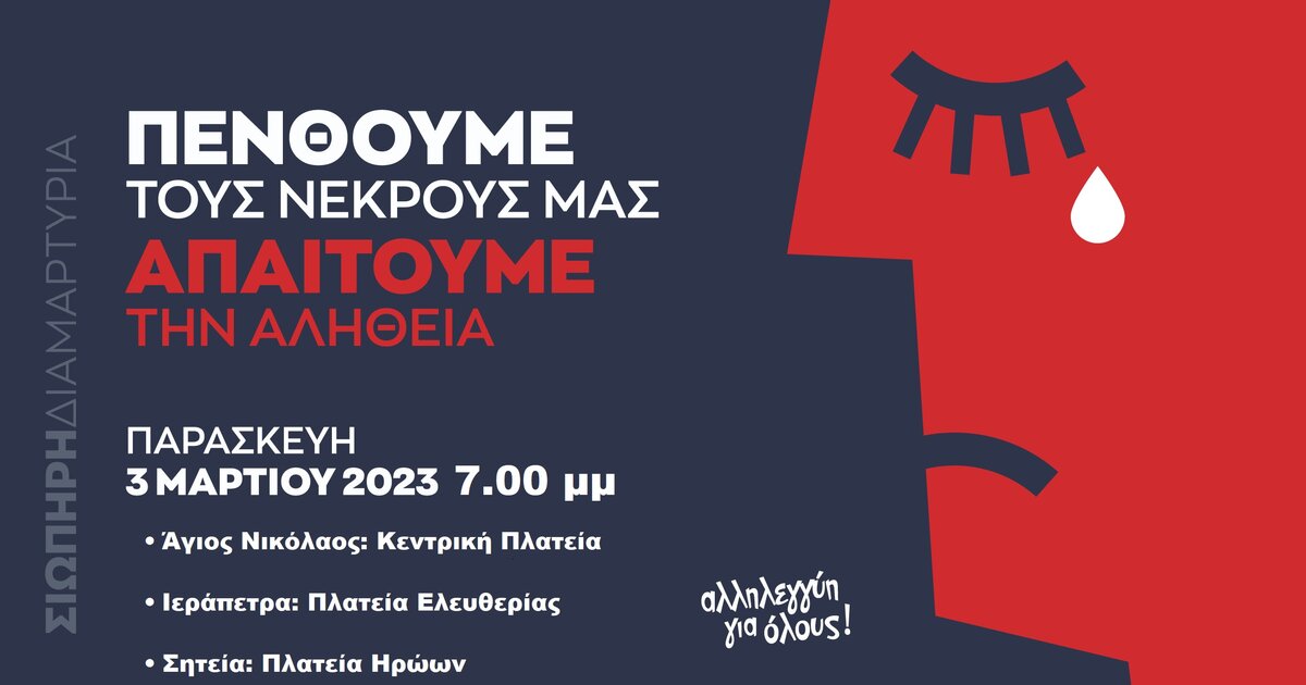 "Βιώνουμε μια ανείπωτη τραγωδία, πενθούμε τον άδικο χαμό δεκάδων κυρίως νέων ανθρώπων, ζητάμε να μάθουμε την αλήθεια. Συμμετέχουμε στην σιωπηρή διαμαρτυρία στις 3 Μαρτίου 2023 στις 7.00 μ.μ. στις τρεις πόλεις του Λασιθίου, κρατώντας ένα κερί και αφήνουμε ένα λουλούδι.