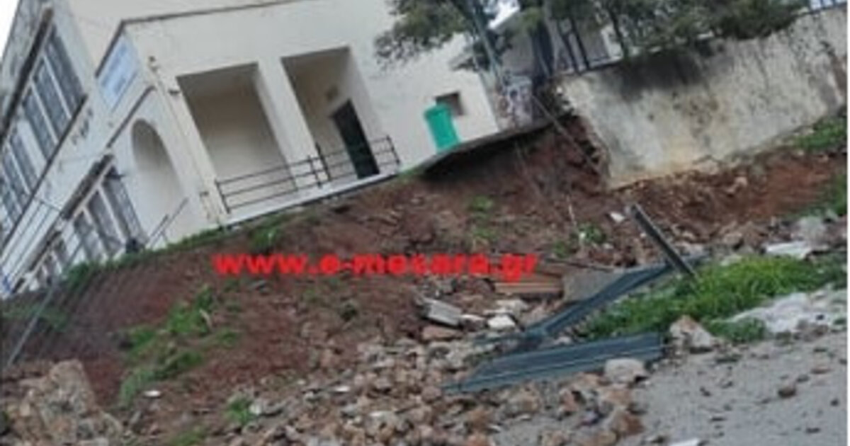Κατά τη διάρκεια της νύχτα, όπως μεταδίδει το e-mesara.gr, που δημοσιεύει και τις σχετικές φωτογραφίες, έπεσε μέρος του τοιχίου που βρίσκεται ανατολικά το σχολείο, ενώ ζημιές έχει υποστεί και η ανατολική σκάλα εισόδου του σχολείου.