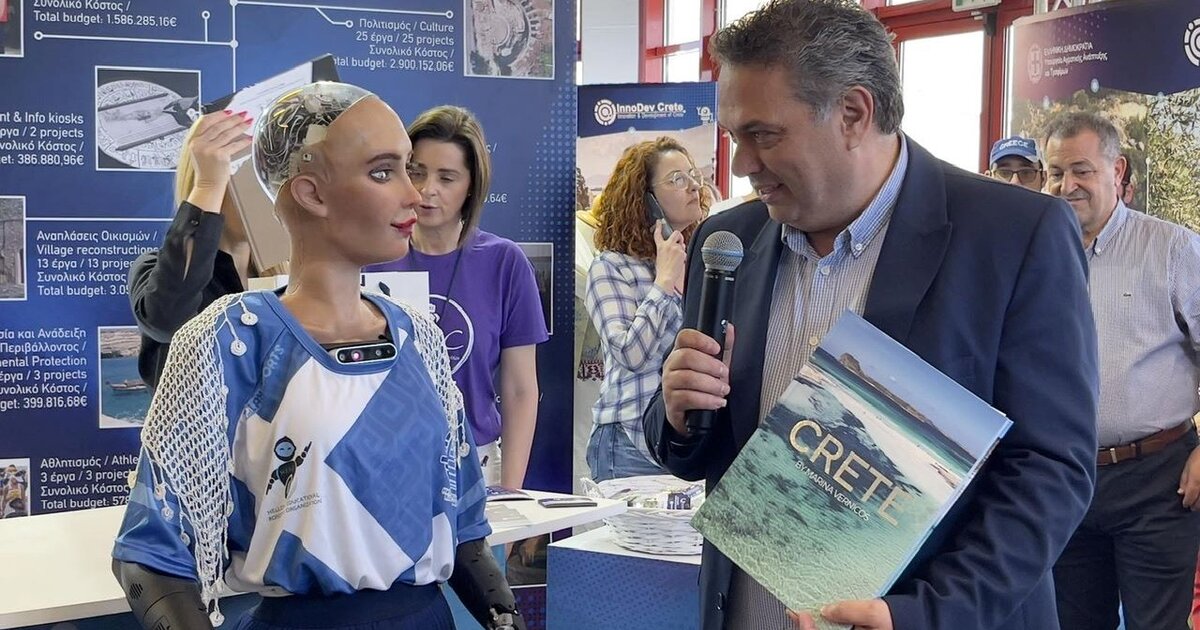 Συνομιλώντας με ένα ρομπότ! Θα μπορούσε να είναι σενάριο ταινίας επιστημονικής φαντασίας. Παρ’ όλα αυτά ήταν μια πραγματικότητα για όλους όσοι είχαν την ευκαιρία να δουν από κοντά και να «συζητήσουν» με τη Sophia, το διασημότερο ρομπότ τεχνητής νοημοσύνης στον κόσμο που επισκέφθηκε και την Κρήτη, στο πλαίσιο ενός κύκλου ταξιδιών που πραγματοποιεί στην Ελλάδα.