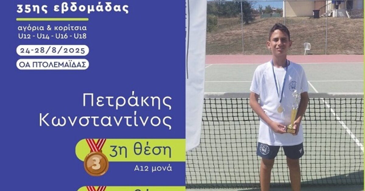 Όπως αναφέρεται σε σχετική ανακοίνωση, ο Κωνσταντίνος Πετράκης συμμετείχε στην κατηγορία Αγόρια 12 ετών, όπου κατέκτησε την τρίτη θέση στα μονά και την πρώτη θέση στα διπλά.