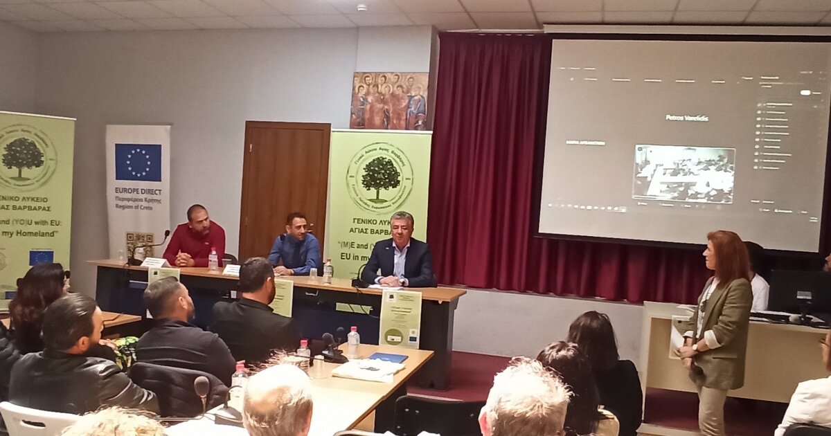 Για το όραμα μιας καλύτερης, δικαιότερης και δυνατότερης Ευρώπης με ένα διακριτό και θετικό ρόλο στα παγκόσμια πράγματα, μίλησε ο Περιφερειάρχης Κρήτης Σταύρος Αρναουτάκης στην εκδήλωση για τη γιορτή της Ευρώπης που οργάνωσε σήμερα το Γενικό Λύκειο Αγίας Βαρβάρας στο πλαίσιο του προγράμματος "Σχολεία Πρέσβεις του Ευρωπαϊκού Κοινοβουλίου."