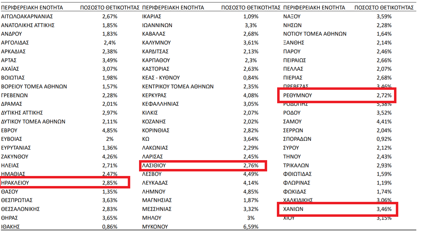 Αναλυτικά η γεωγραφική κατανομή στο νησί, σύμφωνα με τον ΕΟΔΥ - Έως και 3,46% η θετικότητα στο σύνολο των ελέγχων