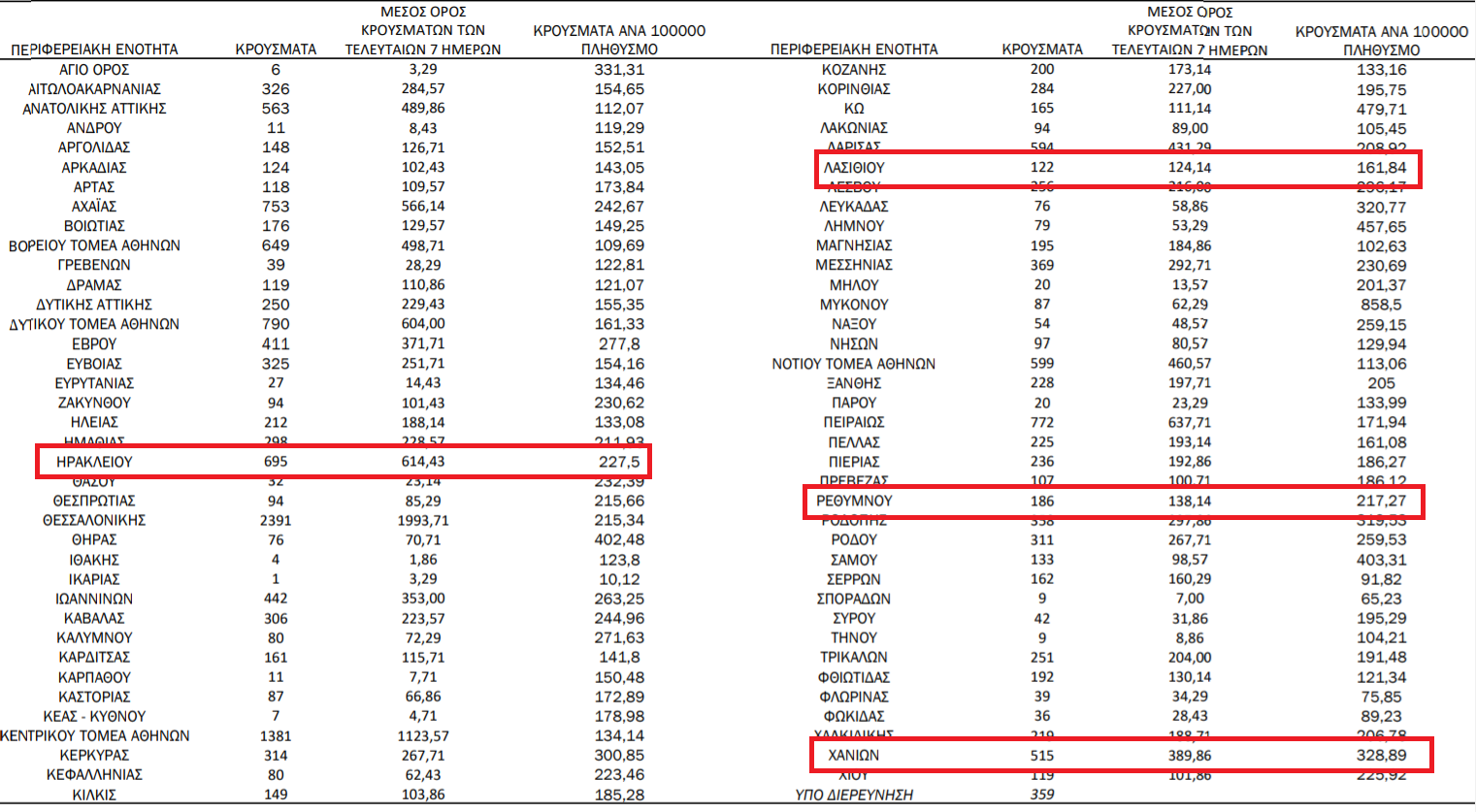 Σύμφωνα με τα στοιχεία της ημερήσιας έκθεσης επιδημιολογικής επιτήρησης τα κρούσματα στην Κρήτη κατανέμονται ως εξής: