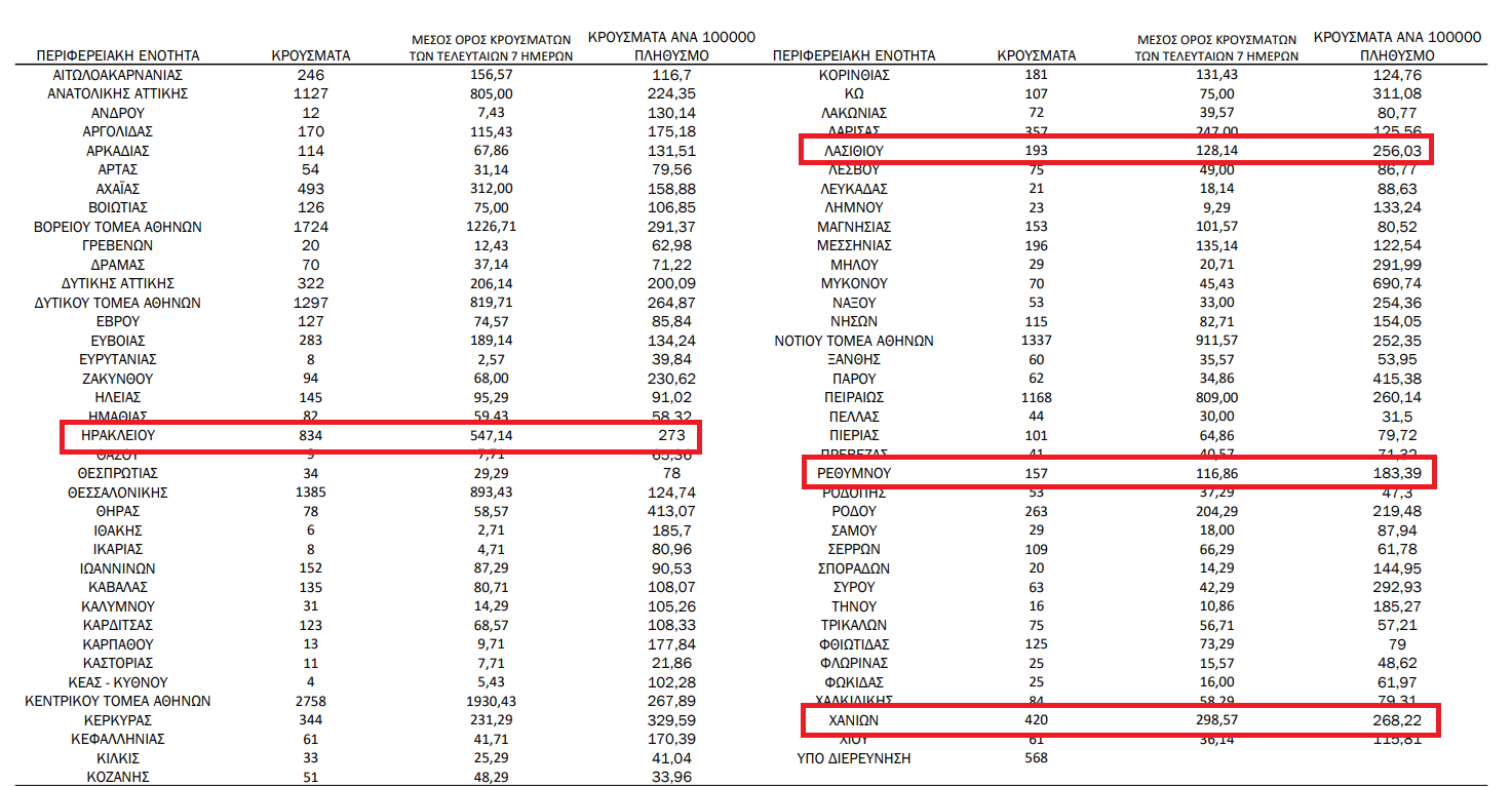 Σύμφωνα με τα στοιχεία της ημερήσιας έκθεσης επιδημιολογικής επιτήρησης τα κρούσματα στην Κρήτη κατανέμονται ως εξής:
