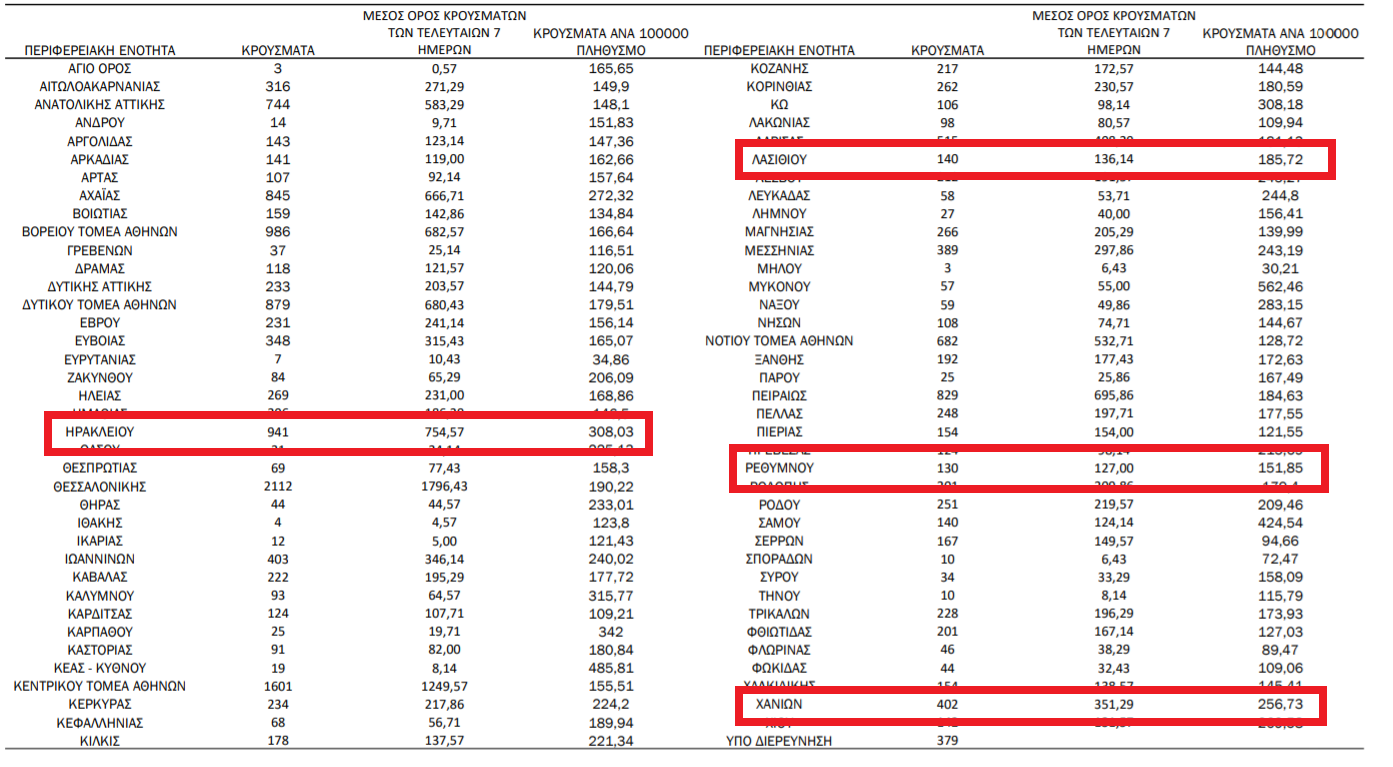 Σύμφωνα με τα στοιχεία της ημερήσιας έκθεσης επιδημιολογικής επιτήρησης τα κρούσματα στην Κρήτη κατανέμονται ως εξής: