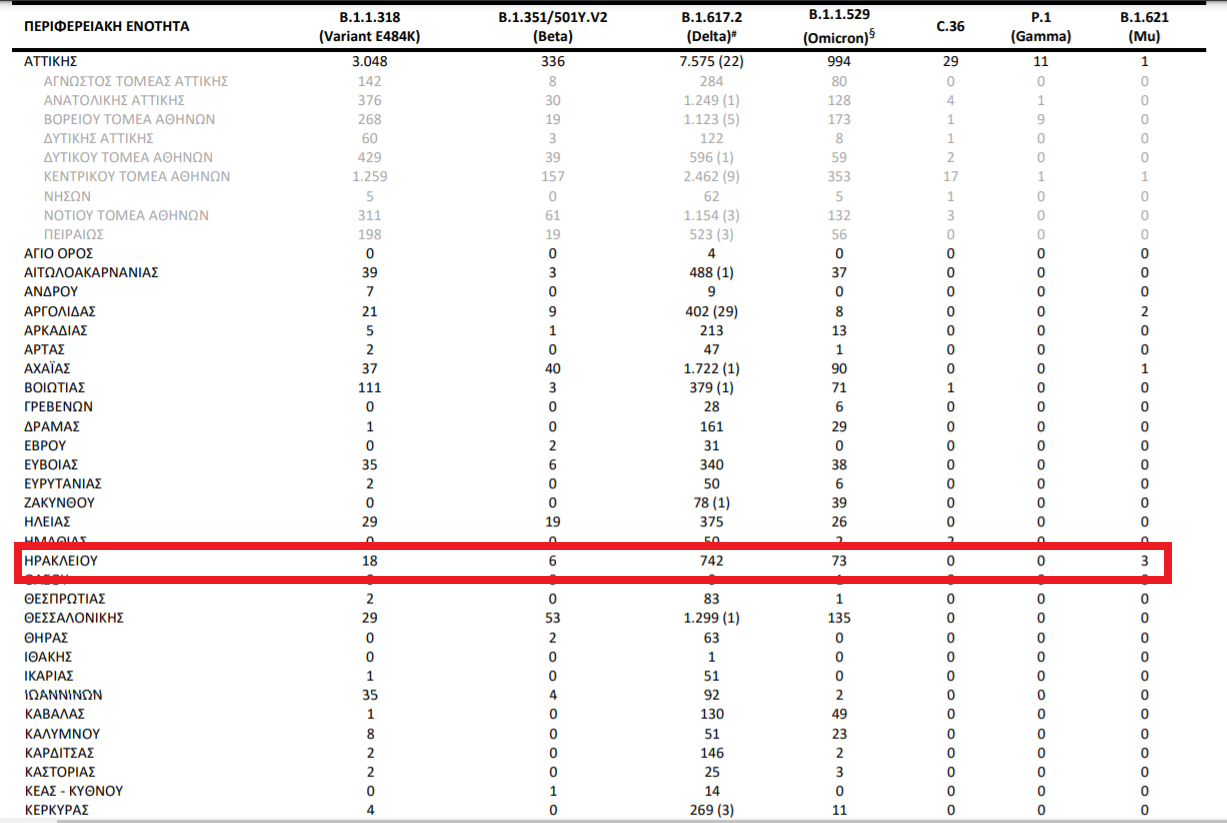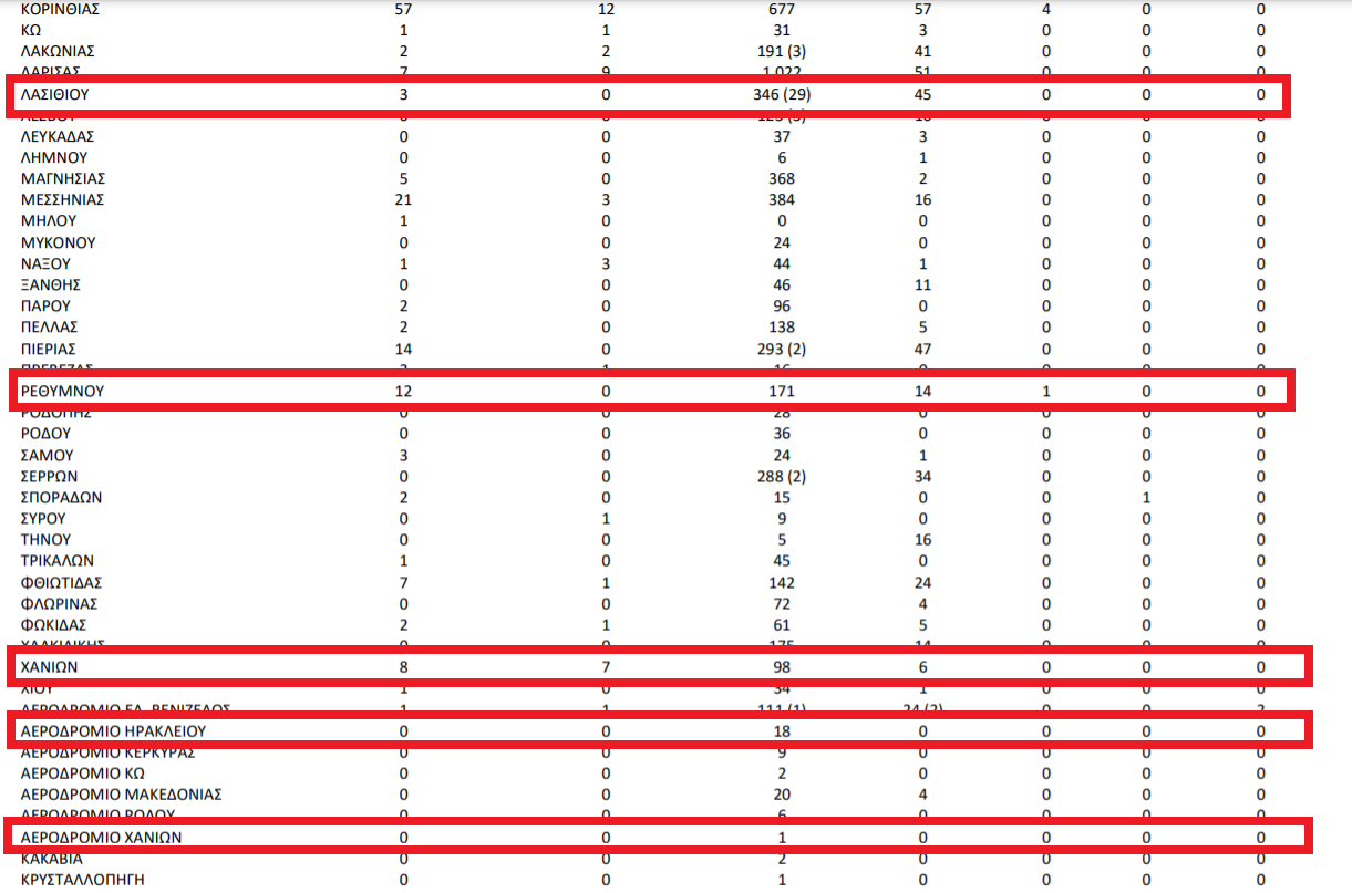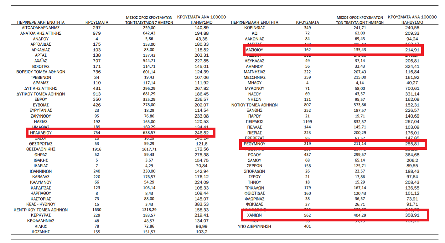Σύμφωνα με τα στοιχεία της ημερήσιας έκθεσης επιδημιολογικής επιτήρησης τα κρούσματα στην Κρήτη κατανέμονται ως εξής: