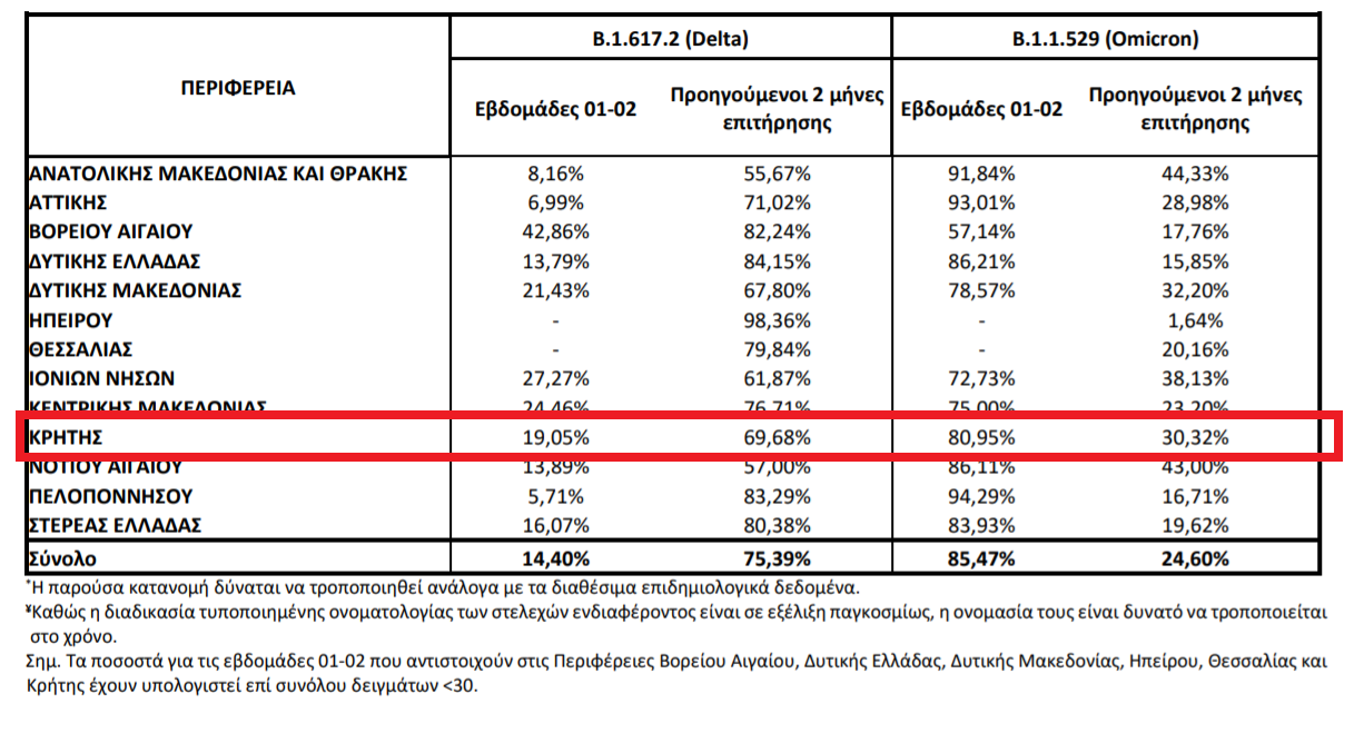 Ποσοστό εγχώριων θετικών δειγμάτων για τα δύο συχνότερα στελέχη ειδικού ενδιαφέροντος του ιού SARS-CoV-2 επί του συνόλου των ελεγχθέντων δειγμάτων από τυχαία δειγματοληψία, ανά Περιφέρεια για το 15νθήμερο από 03/01/2022 έως 16/01/2022 και για το δίμηνο προ της καταληκτικής ημερομηνίας που καλύπτεται από την παρούσα αναφορά, ήτοι 16 Ιανουαρίου 2022.