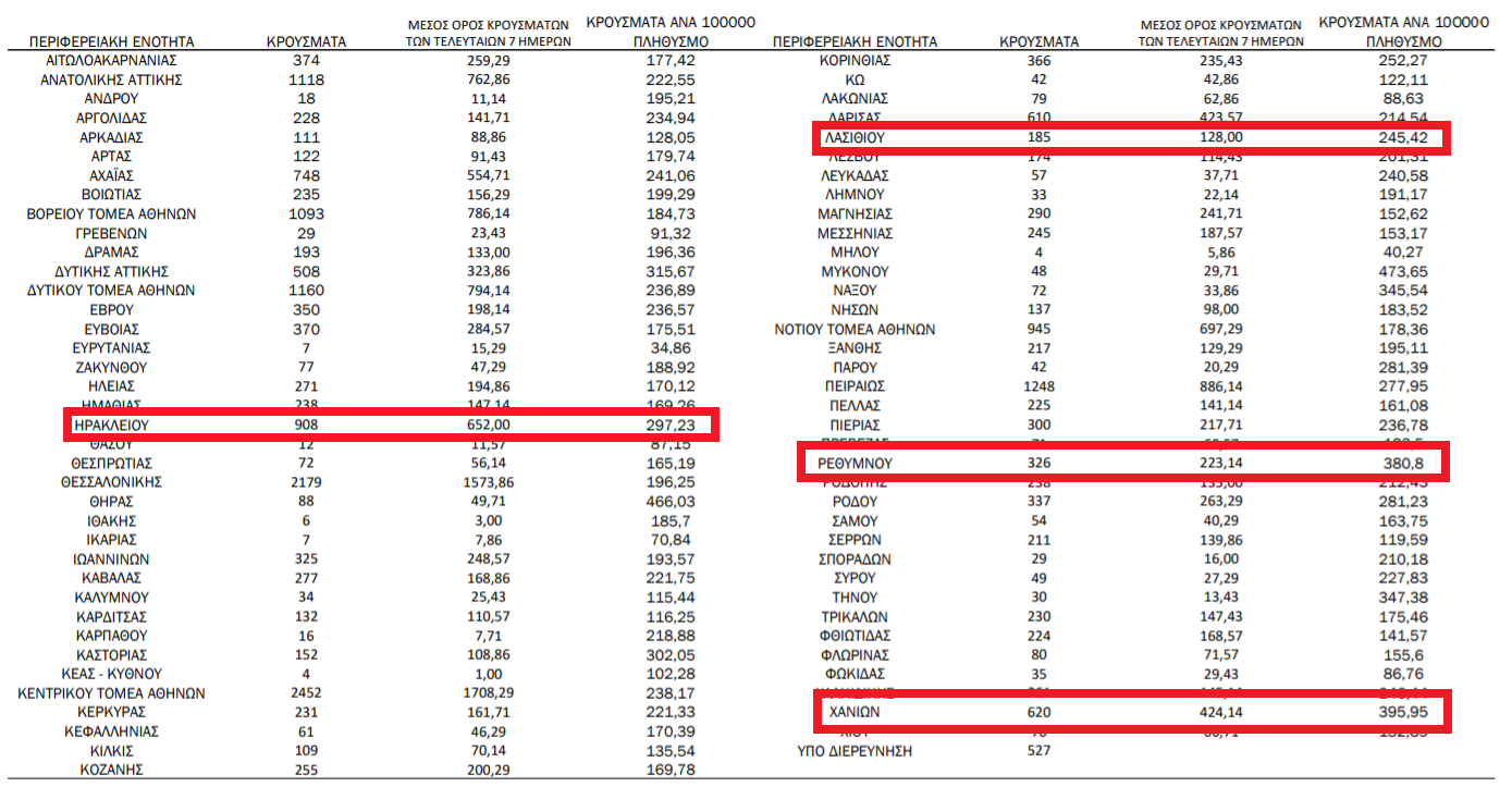 Σύμφωνα με τα στοιχεία της ημερήσιας έκθεσης επιδημιολογικής επιτήρησης τα κρούσματα στην Κρήτη κατανέμονται ως εξής:
