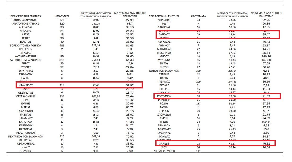 Σύμφωνα με τα στοιχεία της ημερήσιας έκθεσης επιδημιολογικής επιτήρησης τα κρούσματα στην Κρήτη κατανέμονται ως εξής: