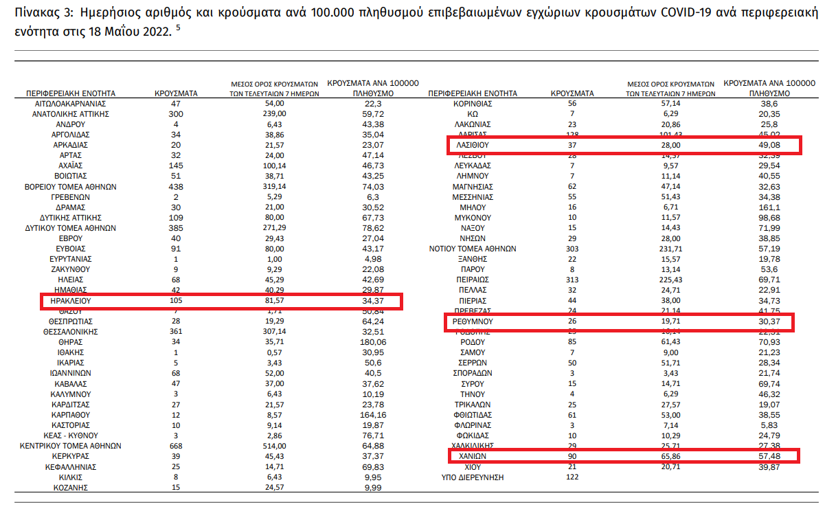 Σύμφωνα με τα στοιχεία της ημερήσιας έκθεσης επιδημιολογικής επιτήρησης τα κρούσματα στην Κρήτη κατανέμονται ως εξής: