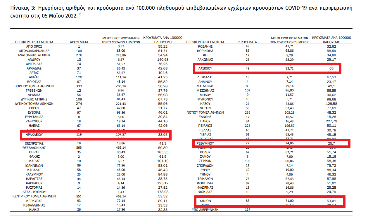 Σύμφωνα με τα στοιχεία της ημερήσιας έκθεσης επιδημιολογικής επιτήρησης τα κρούσματα στην Κρήτη κατανέμονται ως εξής:
