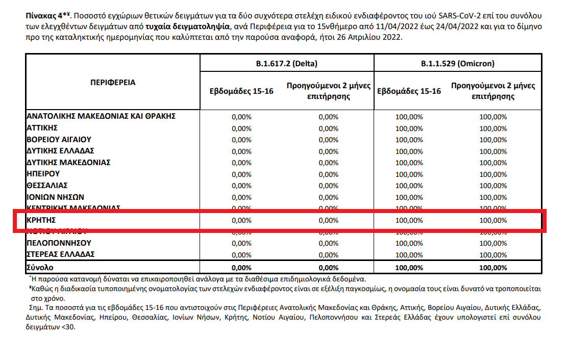 Ολοκληρώθηκε από το Eθνικό Δίκτυο Γονιδιωματικής Επιτήρησης του ιού SARS-CoV-2, που λειτουργεί υπό το συντονισμό του ΕΟΔΥ, η γονιδιωματική ανάλυση σε 407 δείγματα που έχουν επιλεγεί τυχαιοποιημένα ή στοχευμένα και αφορούν στην περίοδο 04 Μαρτίου 2022 έως 26 Απριλίου 2022. Από τον έλεγχο των 408 δειγμάτων, αναγνωρίστηκαν συνολικά 377 δείγματα με στελέχη ειδικού ενδιαφέροντος (Variants Of Concern - VOC), όλα Omicron (B.1.1.529) (Πίνακας 3). Τριακόσια επτά από τα 377 στελέχη Omicron αφορούσαν στο στέλεχος ΒΑ.2 (81%, ενώ την προηγούμενη εβδομάδα το αντίστοιχο ποσοστό ήταν 78%).