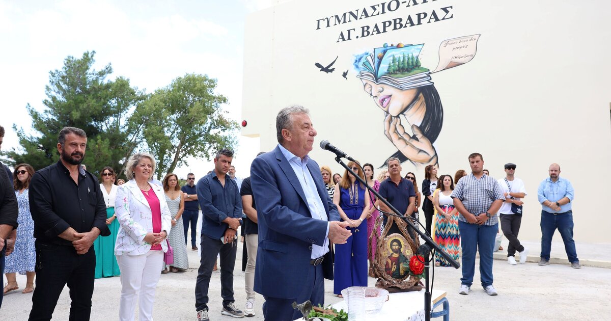 Στο πλαίσιο του καθιερωμένου αγιασμού για την έναρξη της νέας σχολικής χρονιάς πραγματοποιήθηκαν σήμερα τα εγκαίνια της ανακαινισμένης σχολικής μονάδας του Γυμνασίου - Λυκείου Αγίας Βαρβάρας του Δήμου Γόρτυνας, παρουσία του Περιφερειάρχη Κρήτης Σταύρου Αρναουτάκη, του Δημάρχου Γόρτυνας Μιχάλη Κοκολάκη και τοπικών φορέων.