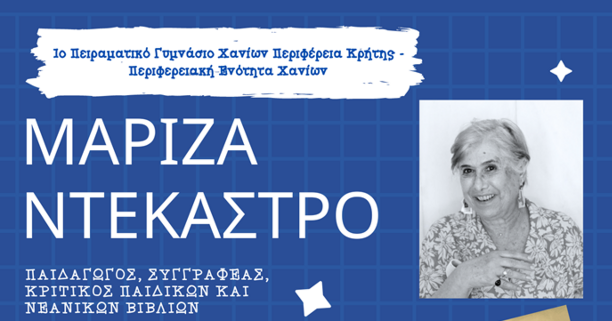Το 1ο Πειραματικό Γυμνάσιο Χανίων, σε συνεργασία με την Περιφέρεια Κρήτης - Περιφερειακή Ενότητα Χανίων, διοργανώνουν τις παρακάτω δράσεις με αφορμή την επίσκεψη στα Χανιά της Μαρίζας Ντεκάστρο (παιδαγωγός, συγγραφέας, κριτικός παιδικών και νεανικών βιβλίων):