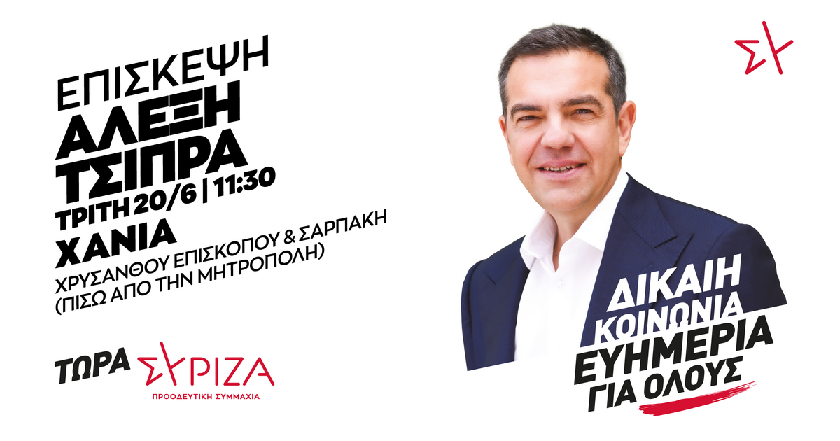 Στα Χανιά, αναμένεται να βρεθεί την Τρίτη 20/6/2023 ο Πρόεδρος του ΣΥΡΙΖΑ-Π.Σ. Αλέξης Τσίπρας.