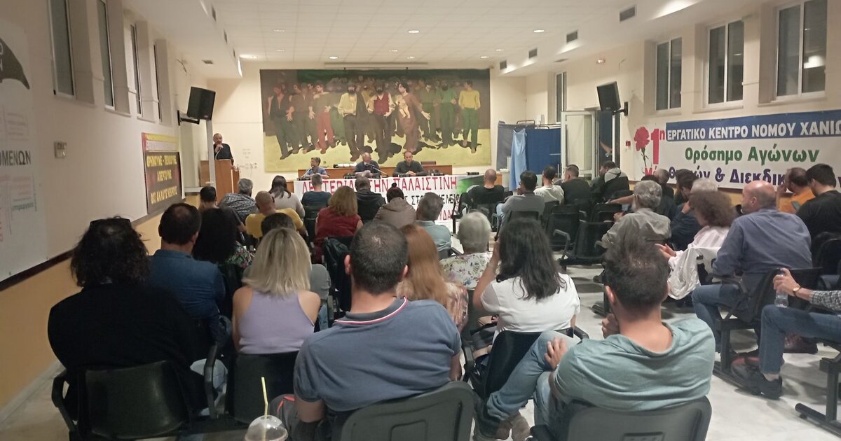 Με μεγάλη επιτυχία πραγματοποιήθηκε την Τετάρτη στο Εργατικό Κέντρο Χανιών η σύσκεψη για την οργάνωση και προετοιμασία του μεγάλου Παγκρήτιου συλλαλητηρίου για την Παλαιστίνη στις 12 του Νοέμβρη στα Χανιά, επισημαίνεται στη σχετική ανακοίνωση της Επιτροπής Ειρήνης Χανίων.
