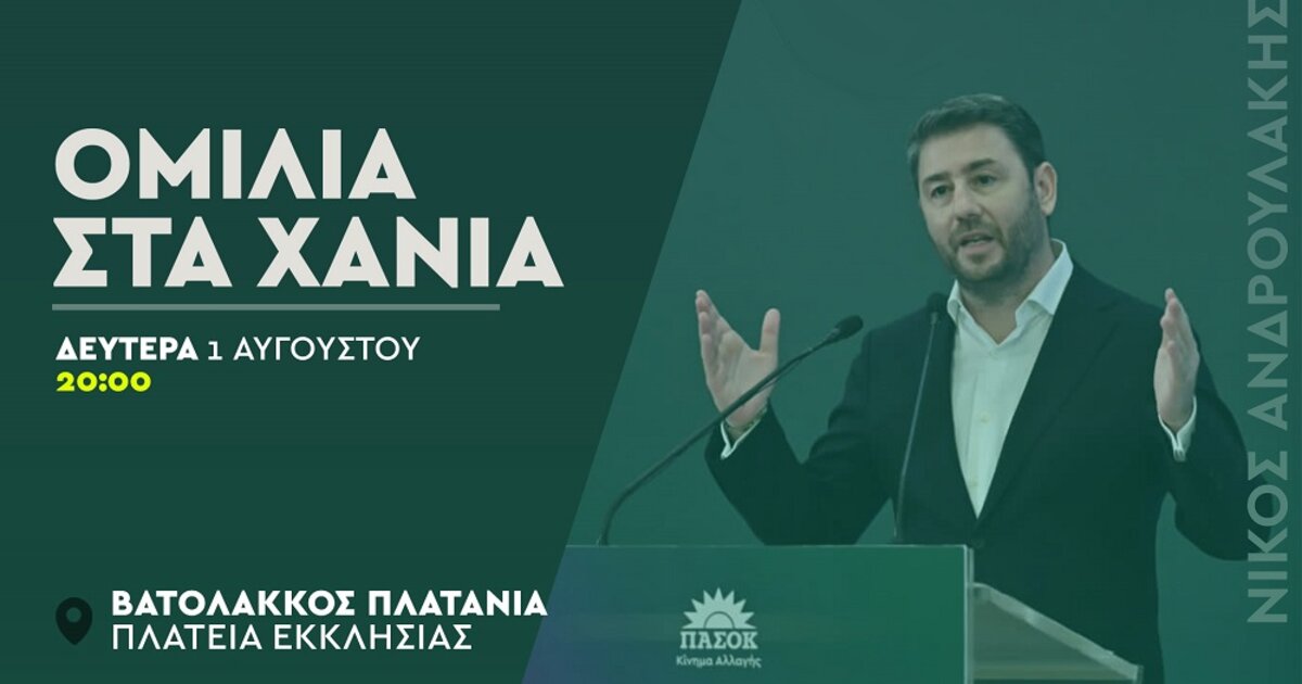 Τέλος, ο Νίκος Ανδρουλάκης το βράδυ της ίδιας μέρας στις 20:00, θα πραγματοποιήσει την κεντρική του ομιλία στα Χανιά, στην πλατεία του Βατόλακκου του Δήμου Πλατανιά.