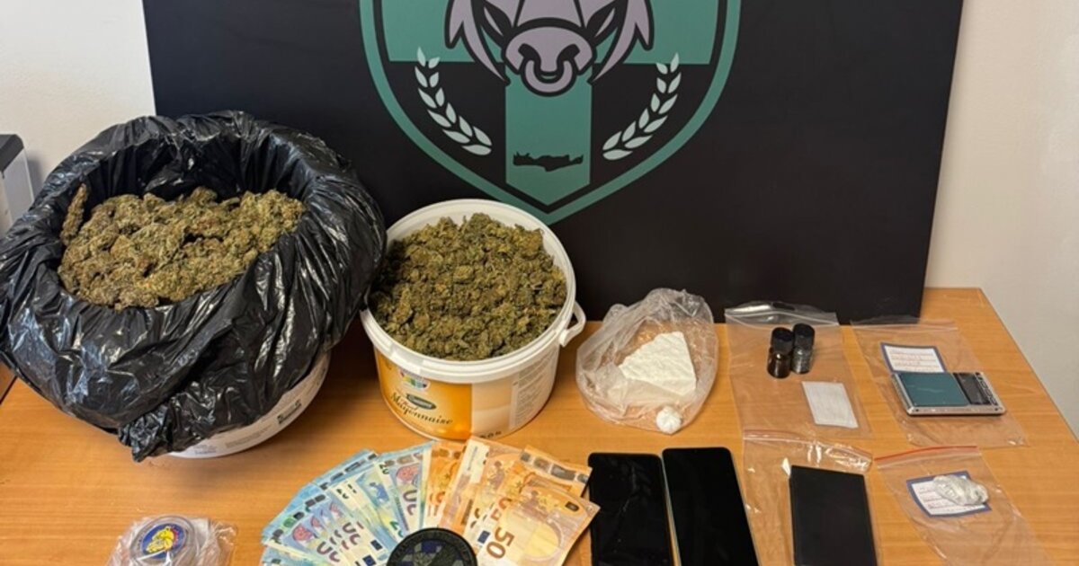 Κατά τον έλεγχο και σε νομότυπη έρευνα στην οικία του, βρέθηκαν και κατασχέθηκαν συνολικά 2 κιλά και 192 γραμμάρια κάνναβης, 206 γραμμάρια κοκαΐνης, δύο ζυγαριές, τριφτής και το χρηματικό ποσό των 1.010 ευρώ, προερχόμενο από την εγκληματική δραστηριότητα.