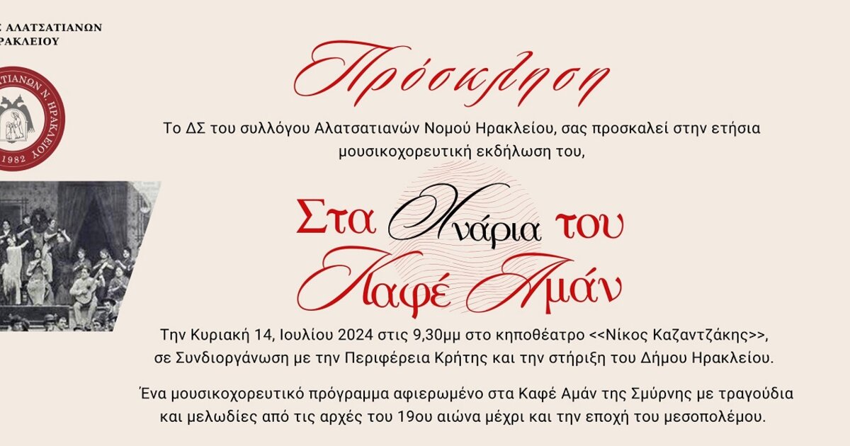 Ο σύλλογος Αλατσατιανών Ηρακλείου σε συνδιοργάνωση με την Περιφέρεια Κρήτης και την υποστήριξη του Δήμου Ηρακλείου, θα παρουσιάσει την Κυριακή, 14 Ιουλίου 2024, στις 9:30μμ το βράδυ στο Κηποθέατρο «Νίκος Καζαντζάκης», την ετήσια μουσικοχορευτική εκδήλωση του, με τίτλο «Στα Χνάρια του Καφέ Αμάν».