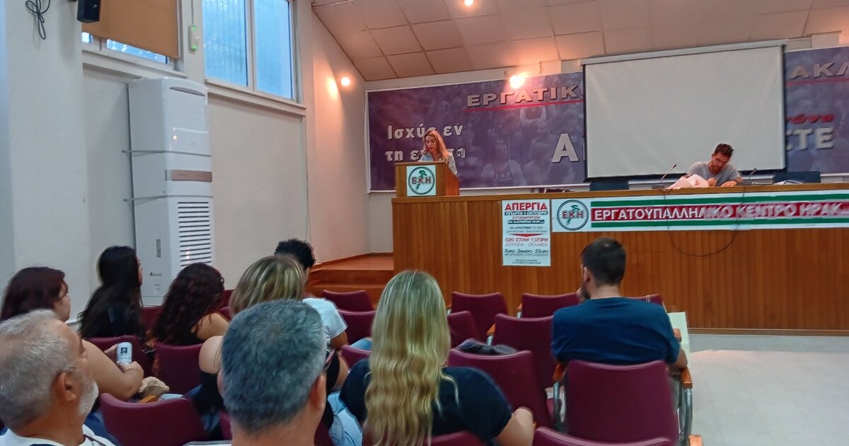 "Πήραμε απόφαση συμμετοχής στην πανελλαδική – πανεργατική απεργία την 1η Οκτώβρη, ενάντια στο νέο νομοσχέδιο – έκτρωμα για την 13ωρη εργασία στον ίδιο εργοδότη. Στο βήμα της συνέλευσης βρέθηκαν εργαζόμενοι και εργαζόμενες από Σούπερ Μάρκετ, εργοστάσια, εμπορικά καταστήματα, το Αεροδρόμιο Ηρακλείου , εταιρείες πληροφορικής.