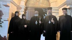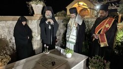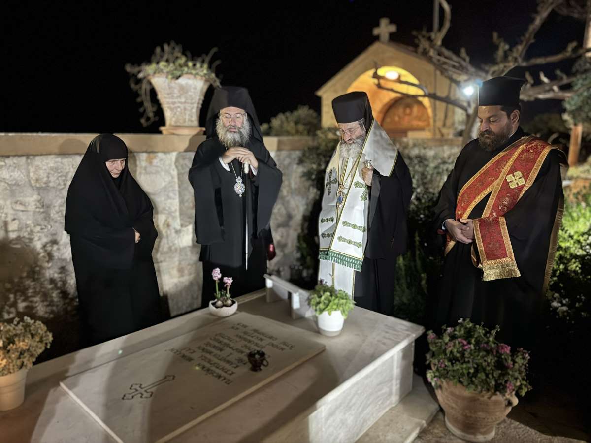 Ακολούθως, ο Θεοφιλέστατος ανέγνωσε Τρισάγιο επί του τάφου της μακαριστής Γεροντίσσης Πανσέμνης, Κτητορίσσης και Καθηγουμένης της Ιεράς Μονής Μεταμορφώσεως του Σωτήρος Χριστού Κουμπέ, και δέχθηκε τη φιλοξενία της Γερόντισσας Μαριάμ και των αδελφών στο Αρχονταρίκι της Μονής.