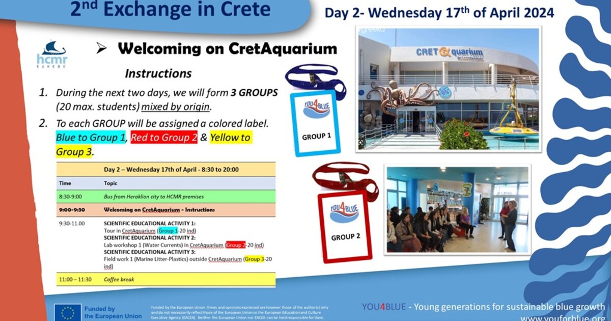 Από τις 16-18 Απριλίου 2024, το Ελληνικό Κέντρο Θαλασσίων Ερευνών σε συνεργασία με τον εκπαιδευτικό οργανισμό Ι.Ε.Κ. ΜΟΡΦΗ, θα φιλοξενήσει στο Ηράκλειο της Κρήτης τη 2η Δράση Ανταλλαγής Μαθητών/τριών, στο πλαίσιο του προγράμματος “YOU4BLUE - Ο ρόλος της νέας γενιάς στη βιώσιμη γαλάζια ανάπτυξη”.