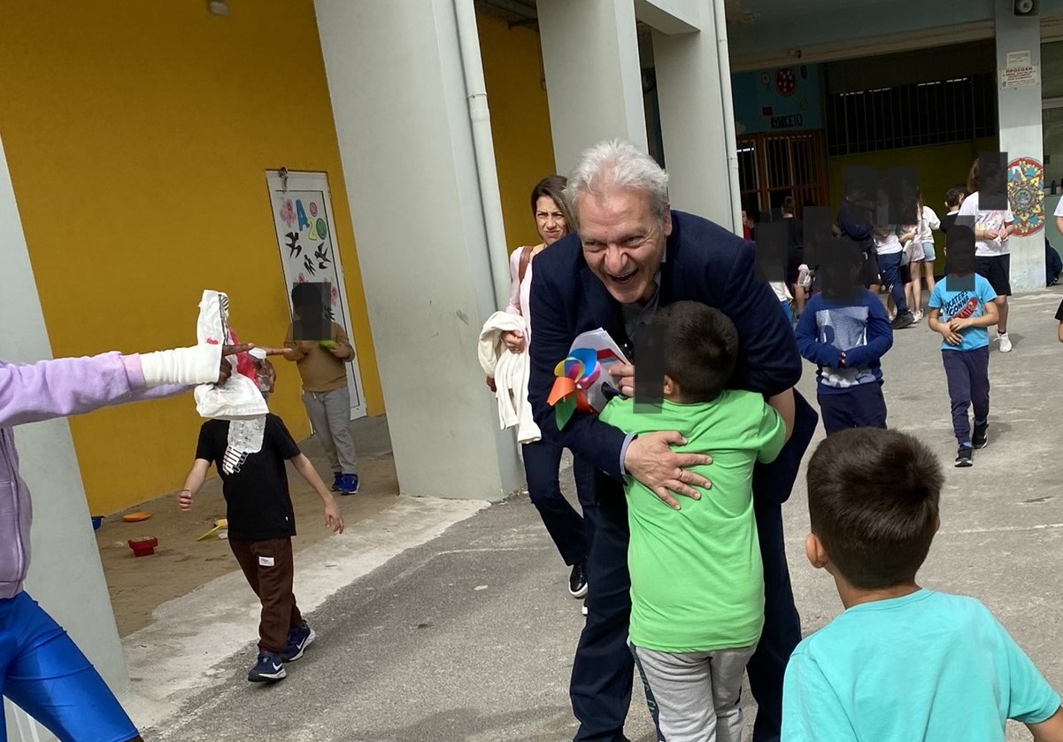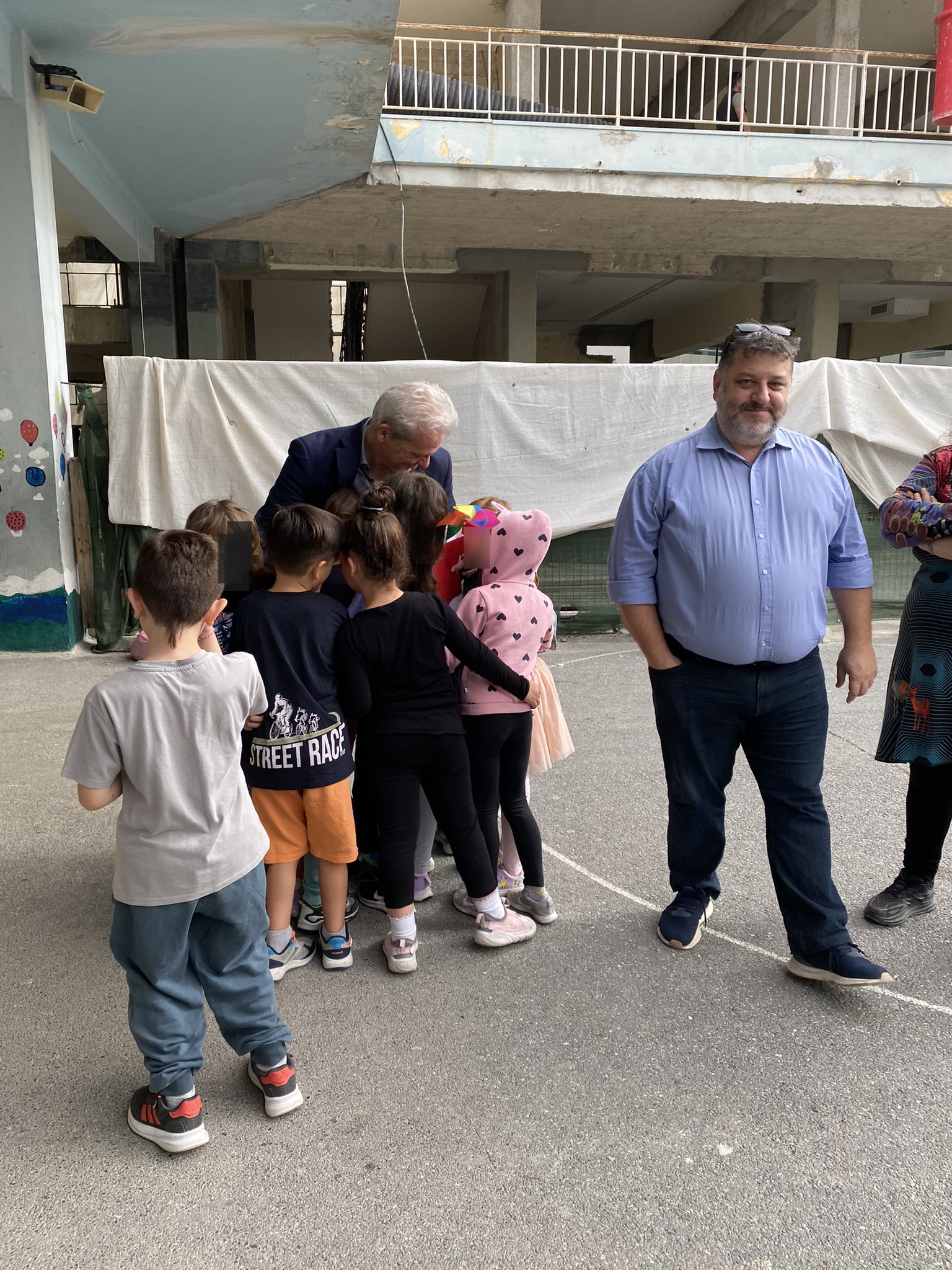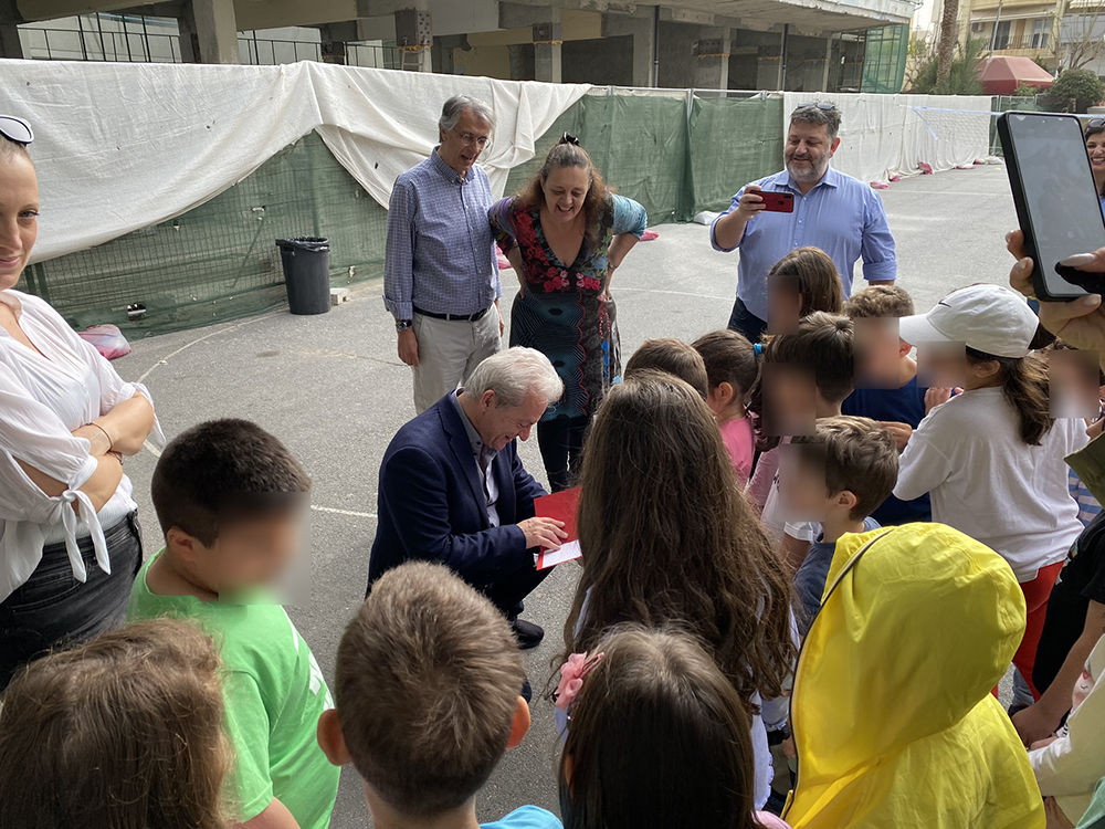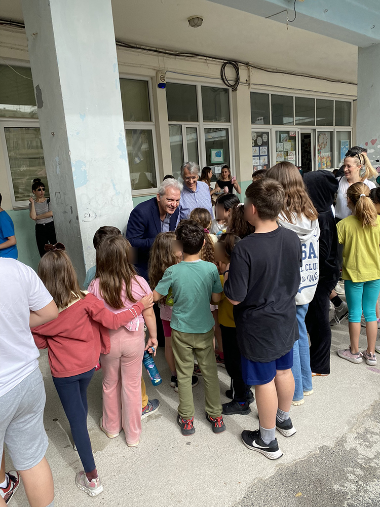 Ιδιαίτερες ήταν όμως και οι στιγμές που ο Δήμαρχος Ηρακλείου βρέθηκε στο προαύλιο του σχολείου μαζί με τις μικρές μαθήτριες και τους μικρούς μαθητές των σχολείων. Ο Αλέξης Καλοκαιρινός μίλησε με τα παιδιά, δέχθηκε δώρα, ενώ έγινε και δέκτης της αγάπης τους, όπως μαρτυρούν οι φωτογραφίες. «Θέλω να ξέρετε ότι όλοι εμείς και η κοινότητα των εκπαιδευτικών, σας αγαπάμε, σας εμπιστευόμαστε και σας νοιαζόμαστε πάρα πολύ. Εσείς είστε η επόμενη γενιά, εσείς κάποια στιγμή – που δεν θα αργήσει και πάρα πολύ – θα πάρετε την πόλη στα χέρια σας. Εμείς προσπαθούμε για να είναι η ζωή καλύτερη στην πόλη, εσείς θα πάτε και τη ζωή και την πόλη πιο μπροστά» τους είπε ο Δήμαρχος Ηρακλείου και πρόσθεσε: «Αυτό που θεωρώ πολύ σημαντικό, είναι να αντιμετωπίζουμε όλους τους άλλους με αγάπη και καλή διάθεση. Να είμαστε με την μεριά της αγάπης. Και η αγάπη είναι για όλους. Όλοι άνθρωποι είναι.». Ο Αλέξης Καλοκαιρινός δεν παρέλειψε να αναφερθεί και στις δράσεις προστασίας του περιβάλλοντος που γίνονται στο σχολείο, λέγοντας: «Εσείς είστε η γενιά που έχει μεγαλύτερη ευαισθησία από εμάς για το περιβάλλον. Για τα δένδρα, για την καθαριότητα, για την ανακύκλωση. Ξέρω ότι τα έχετε στο μυαλό σας.».