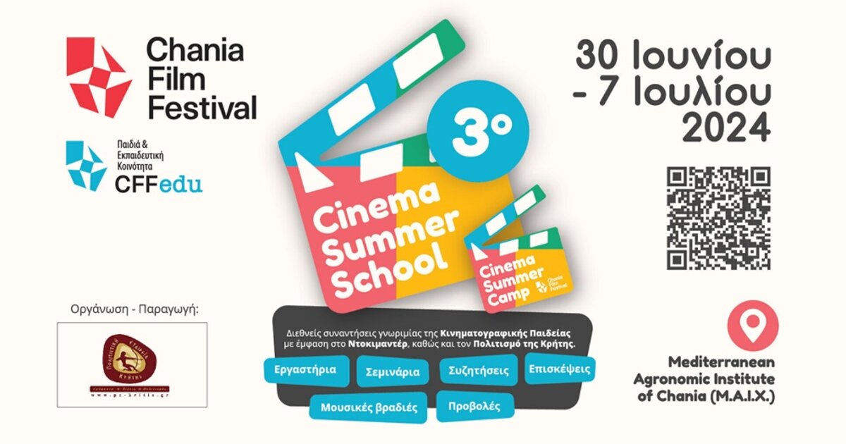 Μετά την μεγάλη επιτυχία που είχε το 1ο και το 22 Θερινό Σχολείο Κινηματογράφου/ Cinema Summer Camp το Φεστιβάλ Κινηματογράφου Χανίων ανακοινώνει το 3ο Θερινό Σχολείο Κινηματογράφου / Cinema Summer Camp το οποίο θα υλοποιηθεί από 30 Ιουνίου έως 7 Ιουλίου 2024 στις εγκαταστάσεις του Μεσογειακού Αγρονομικού Ινστιτούτου Χανίων.