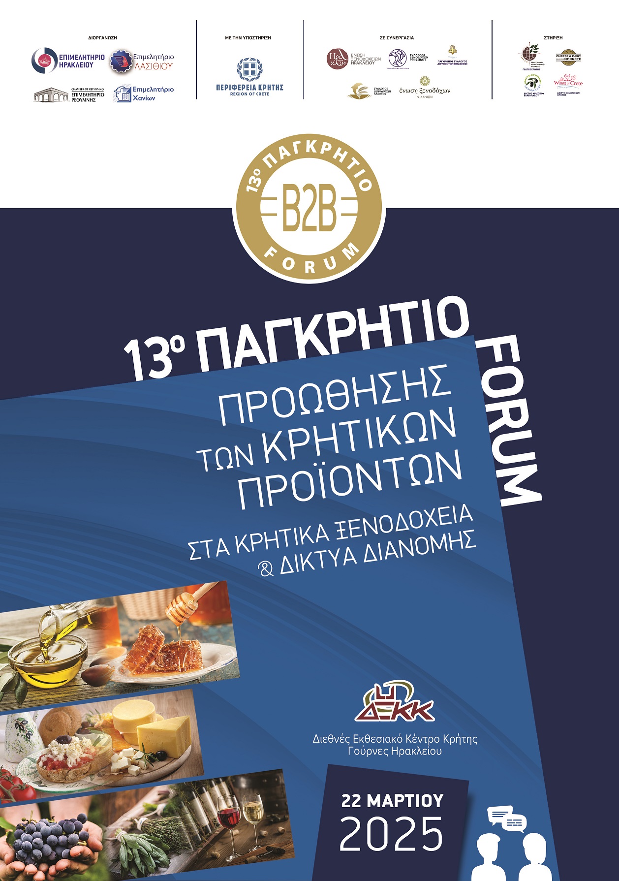 Στο Διεθνές Εκθεσιακό Κέντρο Κρήτης (ΔΕΚΚ), στις Γούρνες, το Σάββατο 22 Μαρτίου 2025, θα διεξαχθεί το «13ο Παγκρήτιο Φόρουμ Προώθησης Κρητικών Προϊόντων στα κρητικά ξενοδοχεία και τα δίκτυα διανομής – σούπερ μάρκετ». Η διοργάνωση, που έχει την στήριξη των παραγωγικών φορέων όλης της Κρήτης, περιλαμβάνει συναντήσεις μεταξύ ξενοδόχων, αγροτών, επαγγελματιών, βιοτεχνών, επιχειρηματιών, μεταποιητών, με στόχο την προώθηση και ενίσχυση συνεργασιών ώστε να καλυφθούν οι ανάγκες των κρητικών ξενοδοχείων και της τοπικής αγοράς από την ντόπια αγροτική παραγωγή και να στηριχθούν η τοπική οικονομία, η αγροτική παραγωγή και η συναφής με τον τουρισμό επαγγελματική/βιοτεχνική δραστηριότητα.