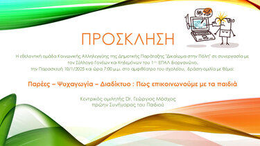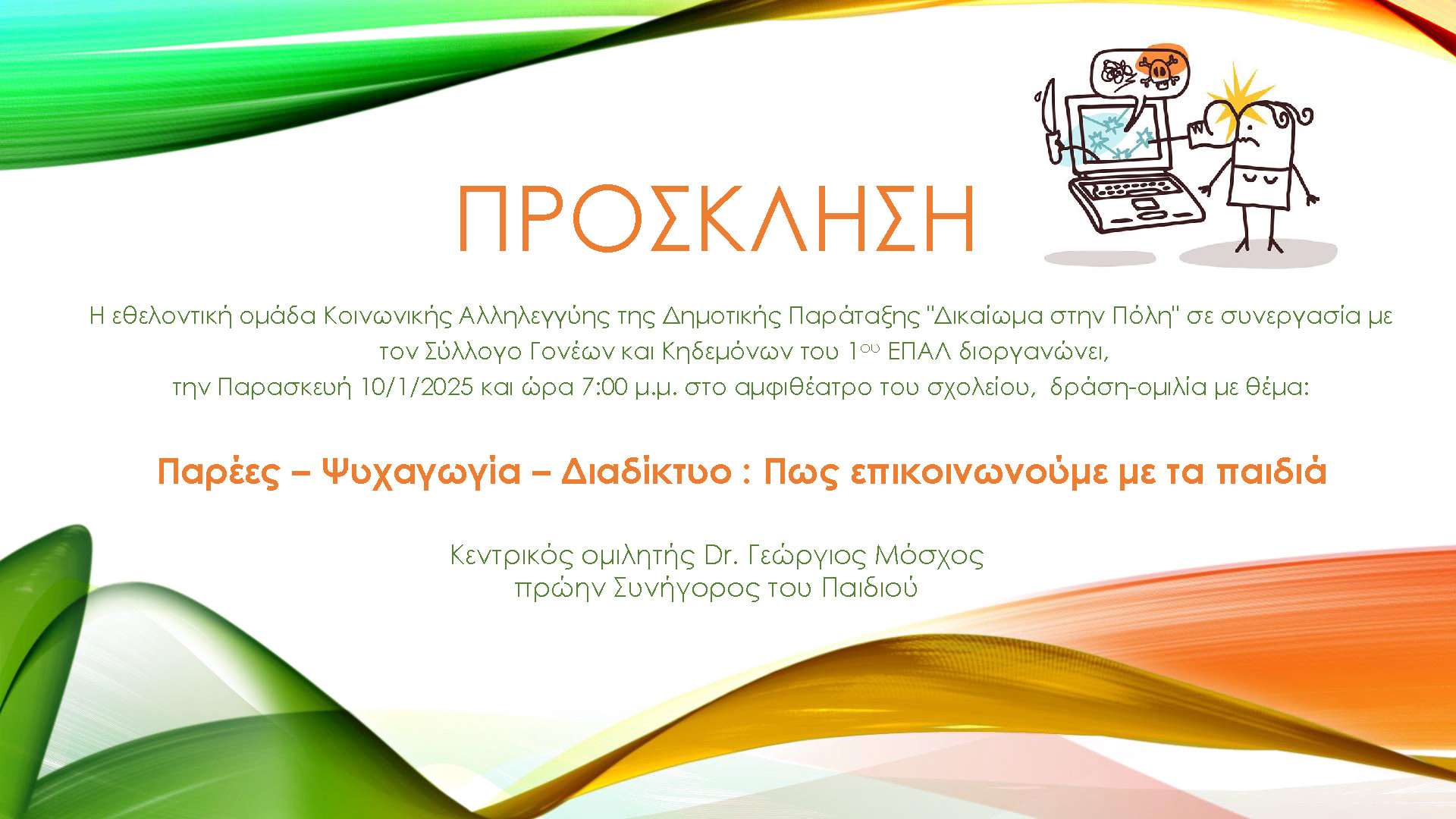 Ο χώρος της συνάντησης θα είναι το αμφιθέατρο του 1ου ΕΠΑΛ την Παρασκευή 10/1/2025 και ώρα 19:00 μμ.. Ομιλητής θα είναι ο Dr Γ. Μόσχος, πρώην Συνήγορος του Παιδιού. Το περιεχόμενο της ομιλίας θα τροφοδοτηθεί από το πρώτο μέρος της δράσης, που θα είναι βιωματική με τους ίδιους τους εφήβους.