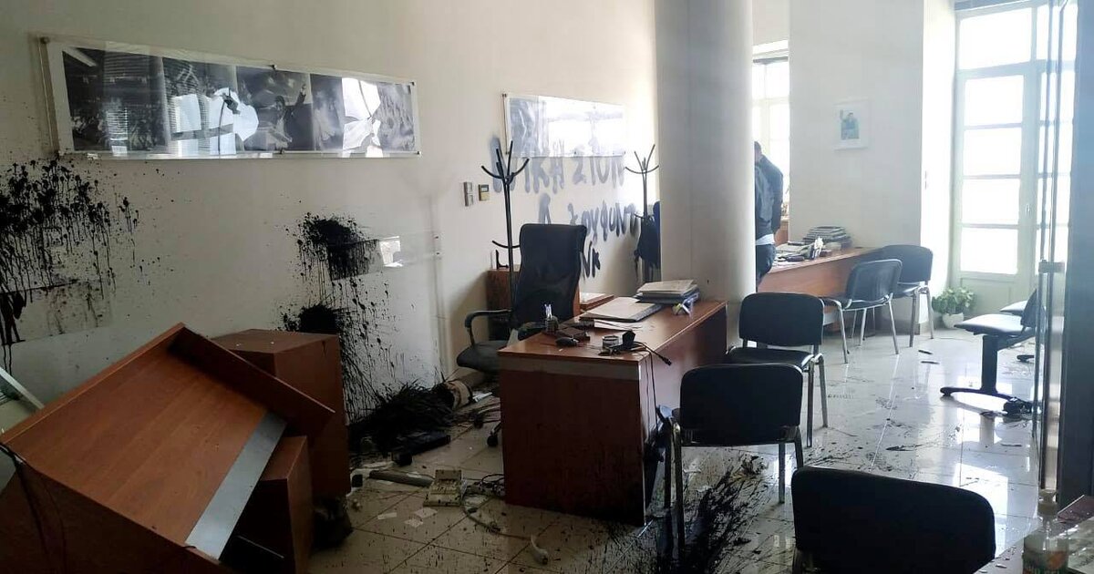Οι άγνωστοι εισέβαλαν τότε στο γραφείο του κ. Αυγενάκη και προκάλεσαν ζημιές, ενώ πέταξαν μπογιές κι έγραψαν συνθήματα στους τοίχους.