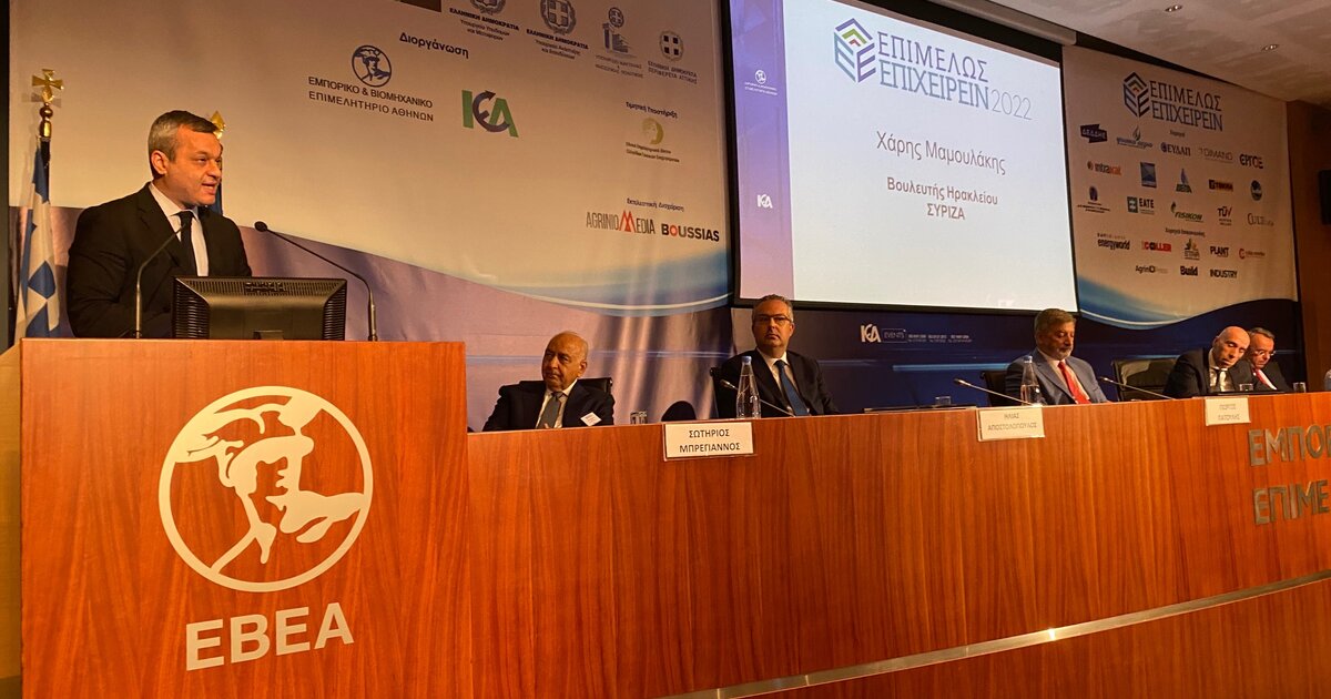 Στο Στρατηγικό Συνέδριο με τίτλο «Επιμελώς Επιχειρείν 2022» που διοργάνωσε το Εμπορικό και Βιομηχανικό Επιμελητήριο Αθηνών την Τρίτη 17/5, παρευρέθηκε και μίλησε ο αν. Τομεάρχης Ανάπτυξης & Επενδύσεων Κ.Ο. ΣΥΡΙΖΑ-ΠΣ, Βουλευτής Ηρακλείου, Χάρης Μαμουλάκης, ως εκπρόσωπος της Κ.Ο. του ΣΥΡΙΖΑ - Προοδευτική Συμμαχία.