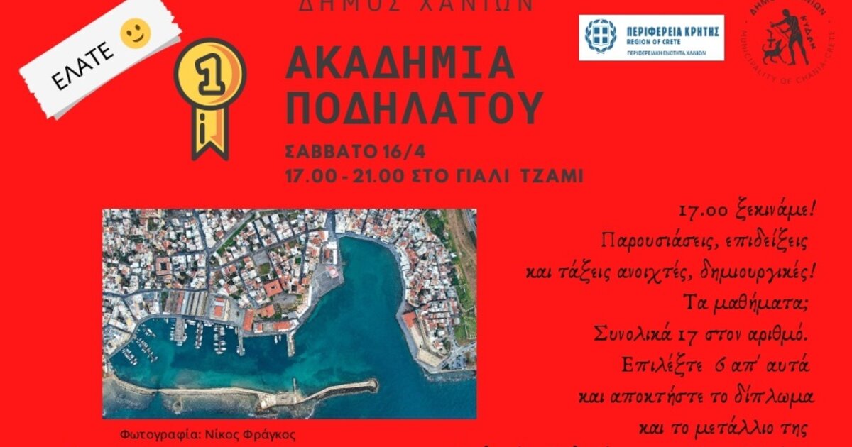 Στο πλαίσιο των παράλληλων εκδηλώσεων ο Δήμος Χανίων, η Περιφέρεια Κρήτης – Περιφερειακή Ενότητα Χανίων και το Δημοτικό Λιμενικό Ταμείο Χανίων διοργανώνουν το Σάββατο 16/4 από τις 17.00 έως τις 21.00 στον εσωτερικό και τον αίθριο χώρο του Γιαλί Τζαμί την 1η Ακαδημία Ποδηλάτου.