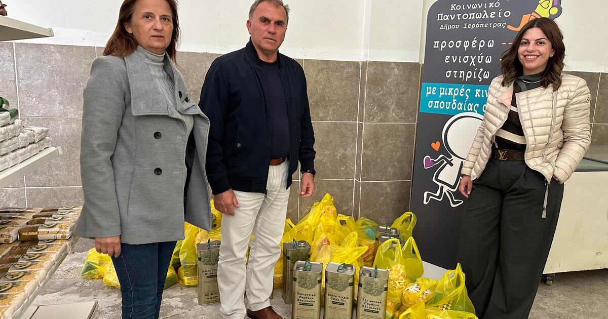 Στη συνέχεια ο Δήμαρχος επισκέφθηκε το κοινωνικό παντοπωλείο Ιεράπετρας όπου παρέδωσε και εκεί ποσότητες ελαιόλαδου, συνομίλησε με ωφελούμενες οικογένειες, διαπίστωσε την επάρκεια των αποθεμάτων του Παντοπωλείου και αντάλλαξε ευχές με το προσωπικό.