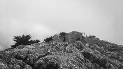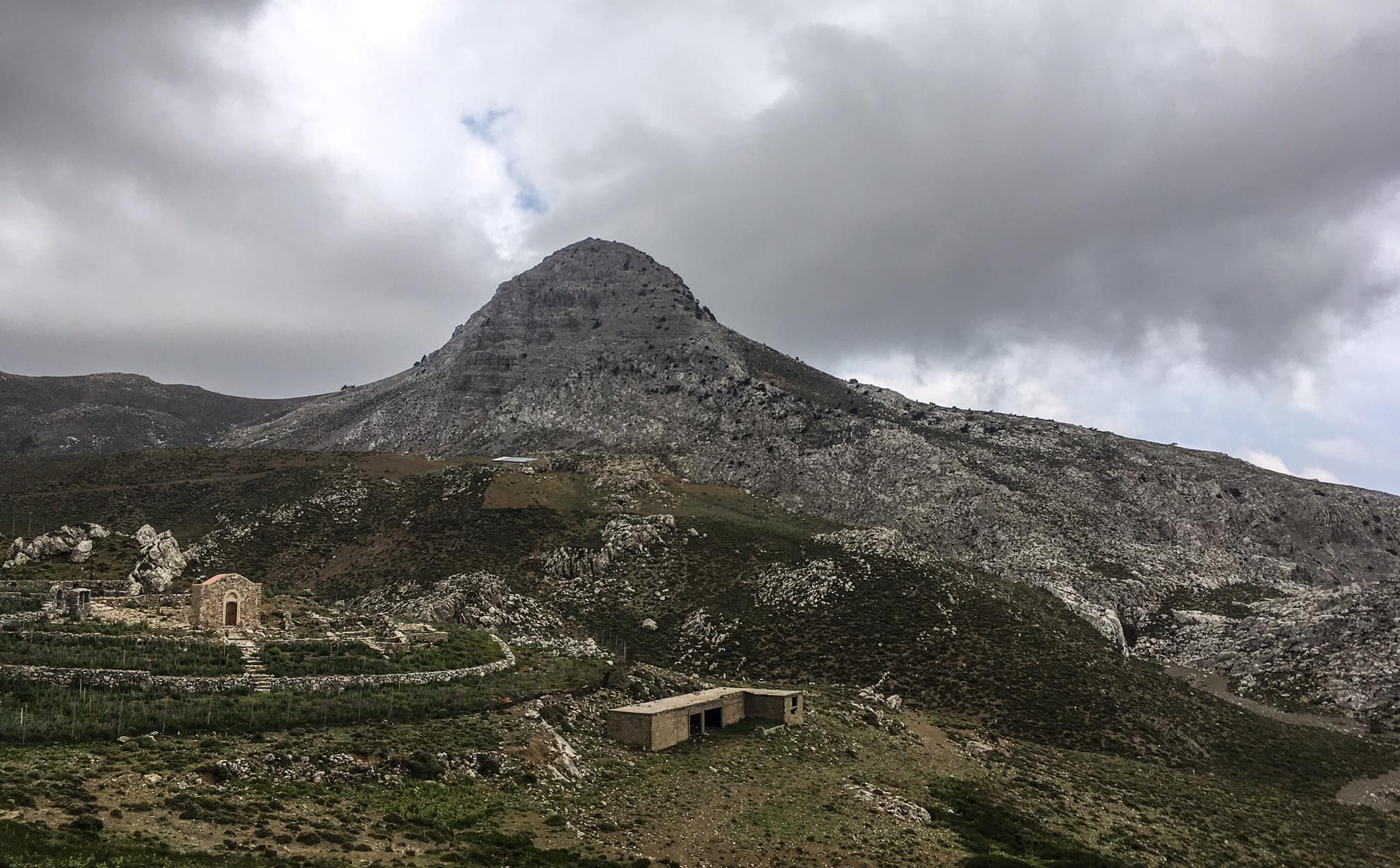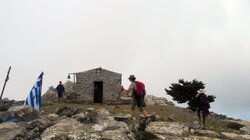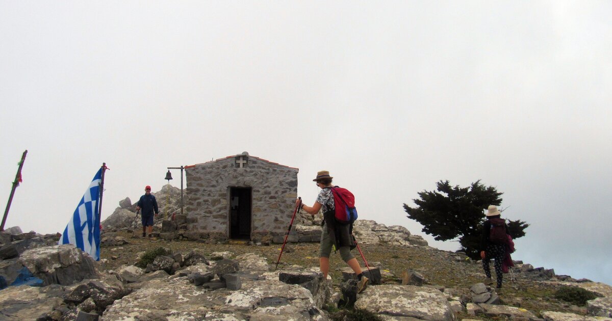 Τέλος με μεγάλη ανακούφιση φτάνουμε στο πλάτωμα, της κορυφής, που μοιάζει με μεγάλη εξέδρα. Εδώ αριστερά φαίνεται το μικρό εκκλησάκι του Τιμίου Σταυρού με την ελληνική σημαία μπροστά του, να ανεμίζει. Ξεχυνόμαστε όλοι προς εξερεύνηση με τα πόδια τρεμάμενα ακόμη. Προσπαθώ να εντοπίσω τα τρία δέντρα, που έχω ακούσει ότι καρποφορούν τα ιερά μηλαράκια, που έχουν το μέγεθος ρεβιθιού κι ανήκουν στο είδος Sorbus umbellata (σορβιά ή αγριοκυδωνιά) και μοιράζονται στους πιστούς τη μέρα της γιορτής, αλλά μάταια. Αντ’ αυτού βλέπω παντού σκαρφαλωμένα κρητικά κυπαρίσσια, που με επιμονή ξεπετάγονται στο αφιλόξενο πετρώδες τοπίο και μερικά κρέμονται στους κάθετους γκρεμούς. Ο καιρός μας κάνει το χατίρι και μας προσφέρει ανοίγματα, όπου μπορούμε να θαυμάσουμε τη θέα στις ακτές της νότιας Κρήτης. Κάτω από μας στους νότιους πρόποδες του βουνού διεξάγεται σήμερα ο 26ος αγώνας ανωμάλου δρόμου του Κουδουμά. Οι φωνές από τα μεγάφωνα των διοργανωτών ακούγονται ως εδώ επάνω. Μπροστά στο εκκλησάκι καθόμαστε και μοιραζόμαστε κολατσιό και μια ρακή για τόνωση. Τη χρειαζόμαστε γιατί η κάθοδος με το κενό να χάσκει μπροστά μας μάς τρομάζει.
