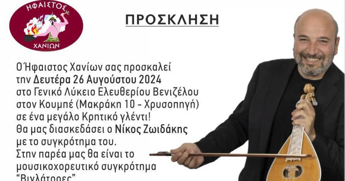 Στο πανηγύρι που διοργανώνει ο Ήφαιστος Χανίων την ερχόμενη Δευτέρα 26 Αυγούστου στον Κουμπέ θα συμμετάσχει ο Νίκος Ζωϊδάκης. Στη σχετική ανακοίνωση των διοργανωτών επισημαίνονται τα εξής: