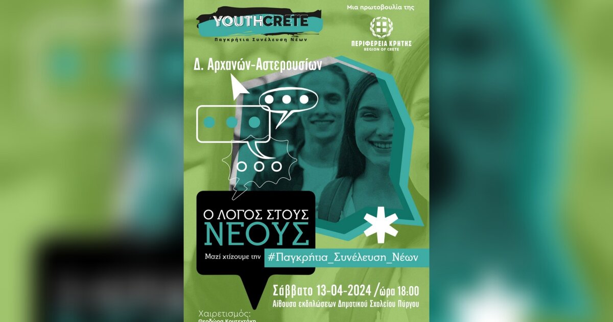 Η Παγκρήτια Συνέλευση Νέων (YouthCrete), είναι πρωτοβουλία της Περιφέρειας Κρήτης, με όραμα να δώσει φωνή στη νεολαία του τόπου. Η Περιφέρεια Κρήτης, με την καθοδήγηση της Εντεταλμένης Συμβούλου Νέας Γενιάς Θεοδώρας Κουτεντάκη, θέτει ως στρατηγική προτεραιότητα την ενεργή συμμετοχή, την ισότιμη πρόσβαση στις ευκαιρίες και τη συνεργασία των νέων.