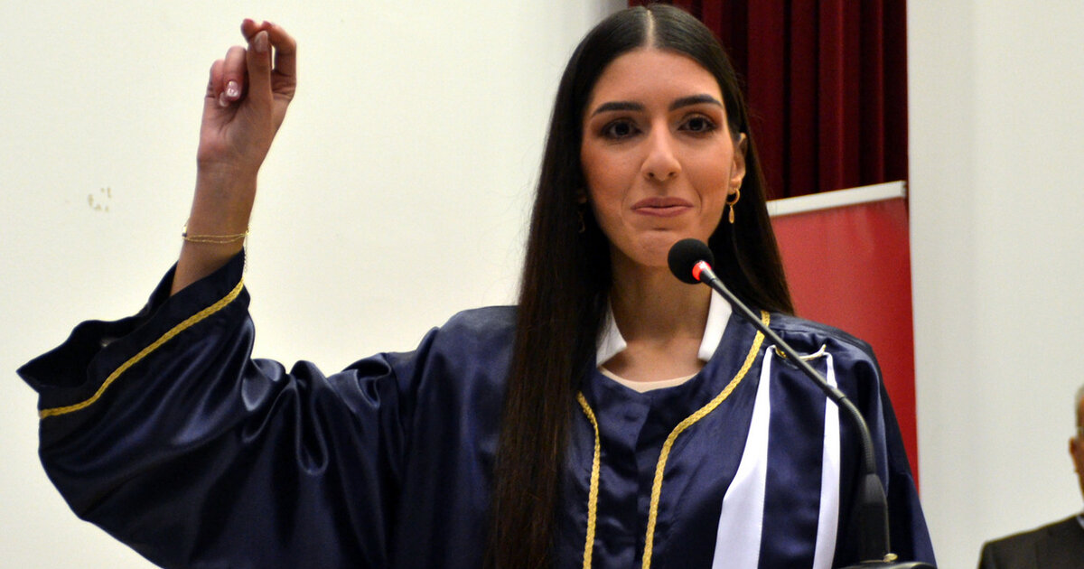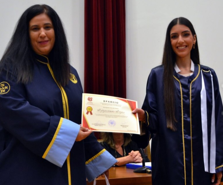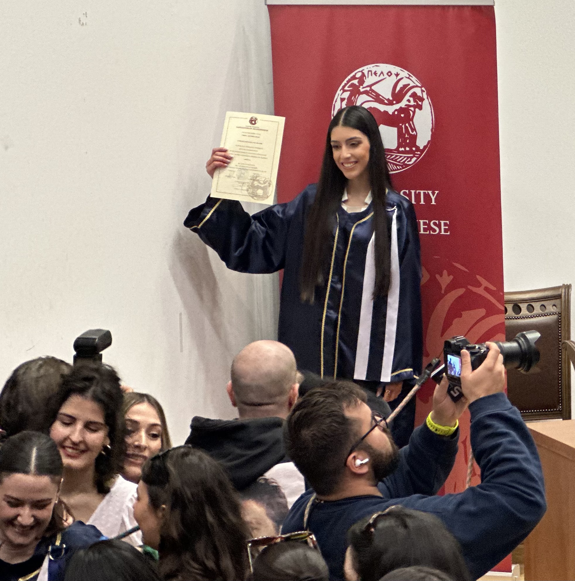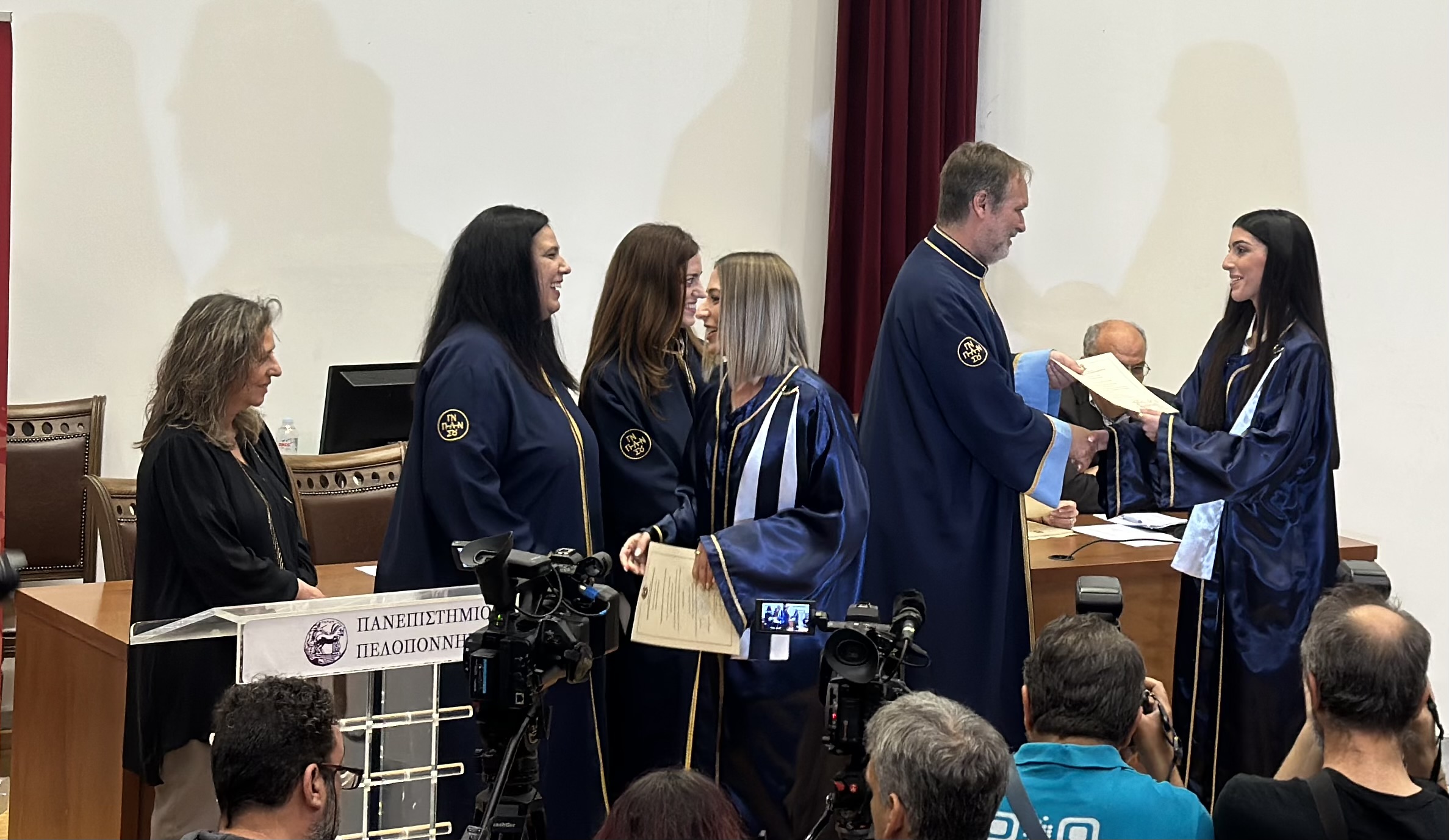 Η απόφοιτη, πια, εκφώνησε τον όρκο, της απονεμήθηκε βραβείο αριστείας από το Πανεπιστήμιο Πελοποννήσου συνοδευόμενο από υποτροφία με σύμβαση για επικουρικό ερευνητικό έργο καθώς και ένα tablet.