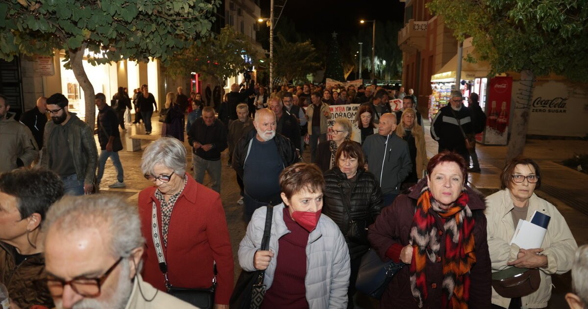 Πορεία διαμαρτυρίας στο κέντρο του Ηρακλείου, στο πλαίσιο της παγκρήτιας κινητοποίησης για τη δημόσια υγεία πραγματοποιήθηκε το απόγευμα της Πέμπτης, ενώ νωρίτερα, έγινε συγκέντρωση στην Πλατεία Ελευθερίας, όπου οι συμμετέχοντες ανέγνωσαν ψηφίσματα συμπαράστασης στον υγειονομικό κόσμο του νησιού.