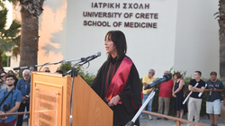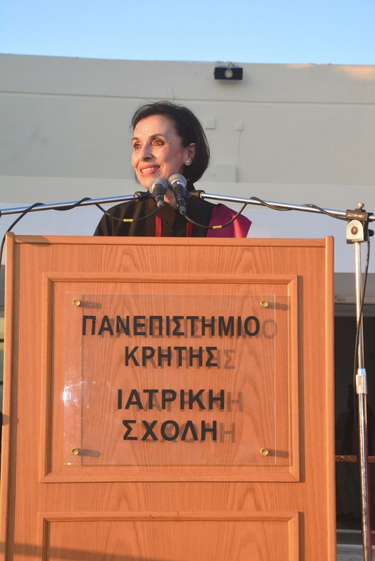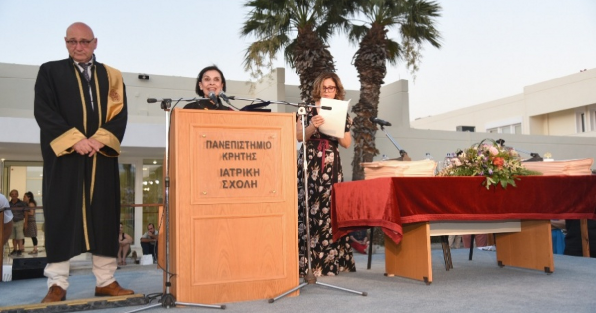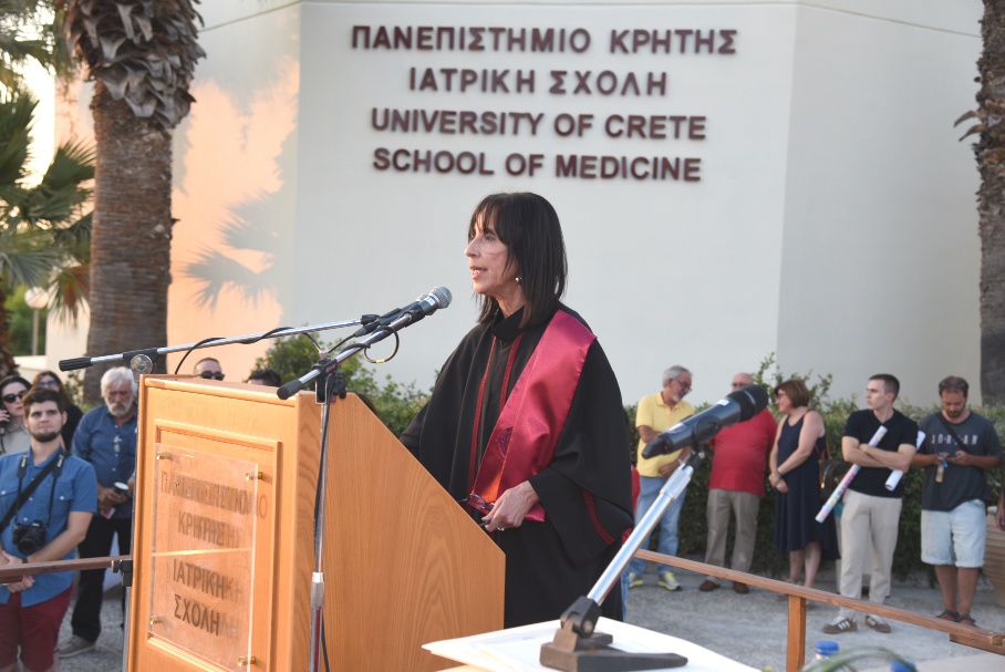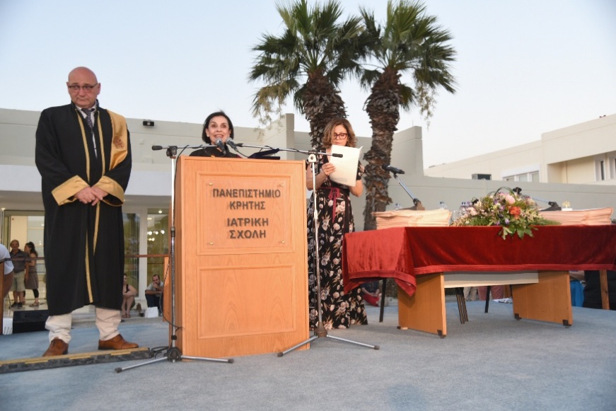 Η Κοσμήτορας της Ιατρικής Σχολής, Καθηγήτρια κ. Ελένη Παπαδάκη, συνεχάρη τους νέους πτυχιούχους και ανέφερε: «Αγαπητοί μας απόφοιτοι, στο τέλος της διαδρομής που μόλις ολοκληρώσατε ανοίγεται μπροστά σας μια νέα, που πλέον θα χαράξετε μόνοι σας – με τις γνώσεις, τις δεξιότητες και τις αξίες που αποκτήσατε στη Σχολή μας. Μια Σχολή που επί 40 χρόνια είναι προσηλωμένη στην Αριστεία και είναι διεθνώς αναγνωρίσιμη. Μια Σχολή που θα είναι πάντα η ταυτότητά σας...Παράλληλα, είναι μία εποχή τεράστιων προκλήσεων και εσείς επωμίζεστε ένα μεγάλο χρέος: να διαφυλάξετε την ηθική ταυτότητα του λειτουργήματός μας. Η εποχή μας δοκιμάζεται από βαθιά κοινωνικά και ηθικά προβλήματα: Οι ανισότητες στην πρόσβαση στις υπηρεσίες υγείας διευρύνονται, οι ευάλωτοι πληθυσμοί αυξάνονται (μετανάστες, πρόσφυγες, άστεγοι, θύματα πολέμων), ο αλτρουισμός απειλείται από εξάντληση και κυνισμό, από αδιαφορία, η Φαρμακοβιομηχανία υπεραναπτύσσεται, η εύκολη διαδικτυακή πληροφορία ασαφοποιεί τη μοναδική σχέση ιατρού-ασθενούς. Να θυμάστε λοιπόν ότι η ζωή του ιατρού είναι συνηφασμένη με το χρέος να υπηρετεί τον άνθρωπο και να τηρεί σε όλη του τη ζωή το περιεχόμενο του όρκου που θα δώσετε σε λίγο. Με τον όρκο αυτό δεσμεύεστε ηθικά για την αφοσίωση στην επιστήμη και τους ασθενείς σας. Με βάση λοιπόν τον όρκο αυτό και με τις επιδόσεις σας που αντικατοπτρίζονται στο πτυχίο σας, η Ιατρική Σχολή σήμερα σας παραδίδει στην Κοινωνία αναγνωρίζοντάς σας ως άξιους να φροντίσετε την ανθρώπινη ζωή, με επιστημονική επάρκεια, ηθική ακεραιότητα και ευαισθησία».