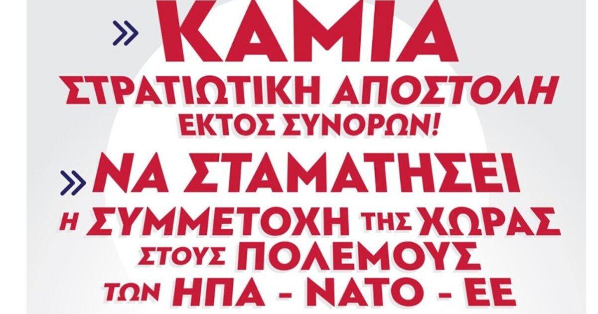 Τώρα είναι η ώρα να ακουστεί ένα μεγάλο ΟΧΙ στη μετατροπή της χώρας μας σε "αιχμή του δόρατος" στους ιμπεριαλιστικούς δολοφονικούς σχεδιασμούς των ΗΠΑ - ΝΑΤΟ - ΕΕ. Έξω τώρα από το μακελειό! Απεμπλοκή της χώρας από τους πολέμους!