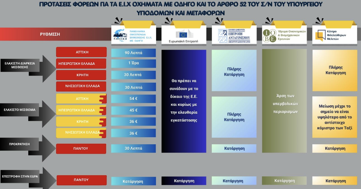 Το ΚΕΦιΜ (Κέντρο Φιλελεύθερων Μελετών) υποστηρίζει την κατάργηση των χρονικών περιορισμών στη μίσθωση, τονίζοντας ότι εφόσον απαιτείται σαφής διαχωρισμός από τα ταξί, αυτός μπορεί να επιτευχθεί μέσω οικονομικών εργαλείων, όπως η διαμόρφωση ελάχιστου τιμήματος σε επίπεδο διαφοροποιημένο από το κόμιστρο ταξί, και όχι μέσω τεχνητών περιορισμών στη διάρκεια της υπηρεσίας.