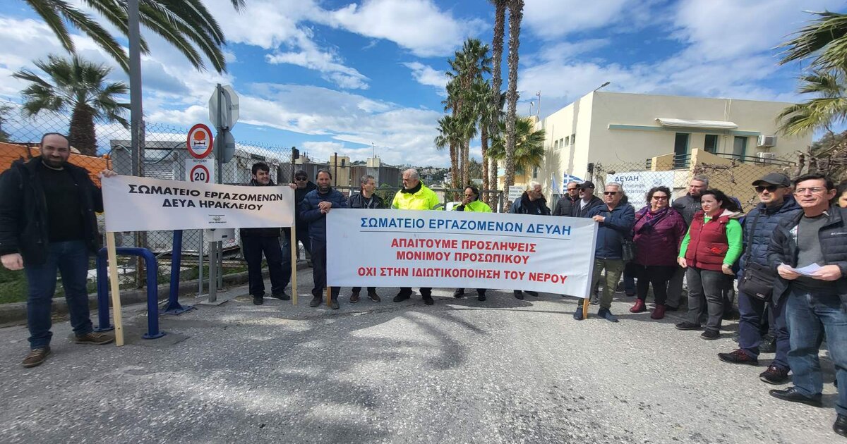 Στον συμβολικό αποκλεισμό των εγκαταστάσεων της ΔΕΥΑ Ηρακλείου στην Φοινικιά προχώρησαν σήμερα Πέμπτη οι εργαζόμενοι στη ΔΕΥΑΗ, διατυπώνοντας έμπρακτα και ηχηρά την πλήρη αντίθεσή τους απέναντι στην φιλοσοφία του νομοσχεδίου για τις ΔΕΥΑ, που είναι σε δημόσια διαβούλευση ως αυριο.