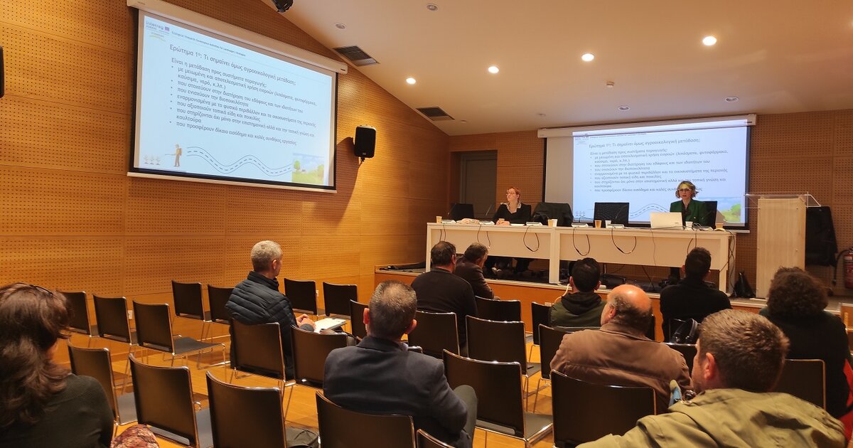 Μέλη της επιστημονικής ομάδας του έργου από το ΜΑΙΧ και συγκεκριμένα οι Φακωτάκης Ε. και Πιλαφίδης Σ. και οι εξωτερικές συνεργάτιδες Δρ Α. Σιντόρη και Β. Κωνσταντιδέλλη ερευνήτριες στο ΙΝΑΓΡΟΚ – ΕΛΓΟ ΔΗΜΗΤΡΑ, παρουσίασαν τα βασικά χαρακτηριστικά του αμπελοοινικού τομέα στους δυο δήμους και στην Κρήτη γενικότερα, αποσαφήνισαν τον όρο αγροοικολογία και αναφέρθηκαν στις καλές αγροοικολογικές πρακτικές καθώς και στην αξιολόγηση της αγροοικολογικής δομής και στα πιλοτικά σχέδια δράσης που αναπτύχθηκαν κατά τη διάρκεια του έργου.