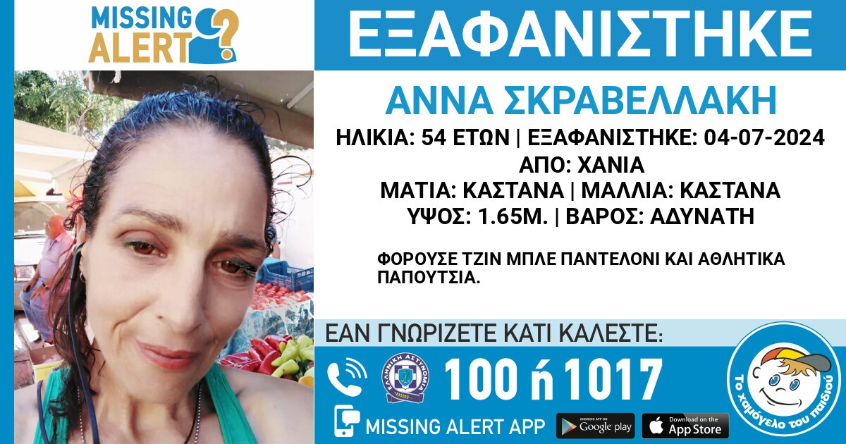 Στις 04/07/2024, στις 09.00πμ, εξαφανίστηκε από την περιοχή των Χανίων, η Σκαρβελλάκη Άννα, 54 ετών.