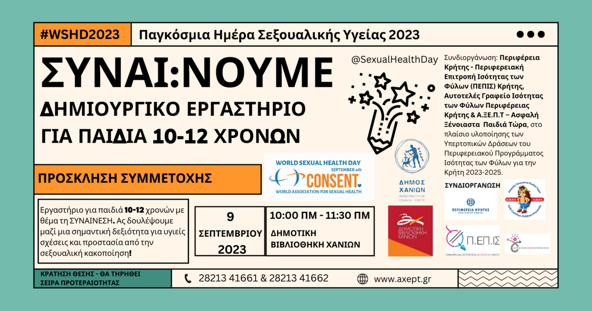 To Σάββατο 9 Σεπτεμβρίου 2023, από τις 10.00 έως τις 11.30, θα πραγματοποιηθεί στη Δημοτική Βιβλιοθήκη Χανίων η εκδήλωση με θέμα: «ΣΥΝΑΙ:NOYME - Συναίνεση, μία σημαντική δεξιότητα για υγιείς σχέσεις και προστασία από τη σεξουαλική κακοποίηση».