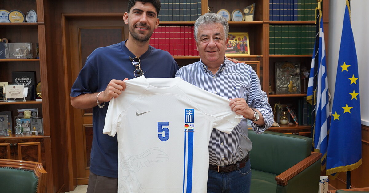 Ο διεθνής ποδοσφαιριστής χάρισε στον Περιφερειάρχη Κρήτης τη φανέλα με το εθνόσημο και το νούμερο «5» που φέρει το όνομα του διακεκριμένου αθλητή, ενώ ο Σταύρος Αρναουτάκης ευχήθηκε «πάντα επιτυχίες στην εθνική μας ομάδα, να μας ενώνει και να μας κάνει περήφανους».