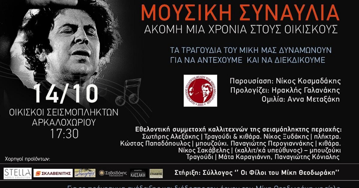 Συναυλία με τραγούδια του Μίκη Θεοδωράκη στους οικίσκους των σεισμόπληκτων του Αρκαλοχωρίου θα πραγματοποιηθεί, το ερχόμενο Σάββατο 14/10 /2023 στις 5:30 το απόγευμα, μέσα στο πλαίσιο του προγράμματος ανάδειξης και διάδοσης του Μίκη Θεοδωράκη και με τίτλο: "Η Πνευματική και Μουσική δωρεά του Μίκη Θεοδωράκη στον Ελληνικό Λαό"