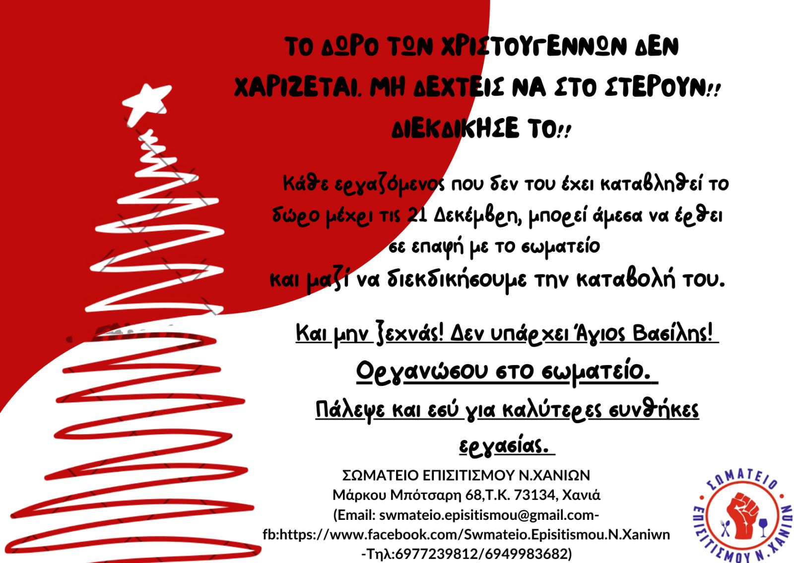Απαντάμε καθαρά: είναι αδιαπραγμάτευτο να καταβληθεί το Δώρο Χριστουγέννων στο ακέραιο σε όλους εργαζόμενους!